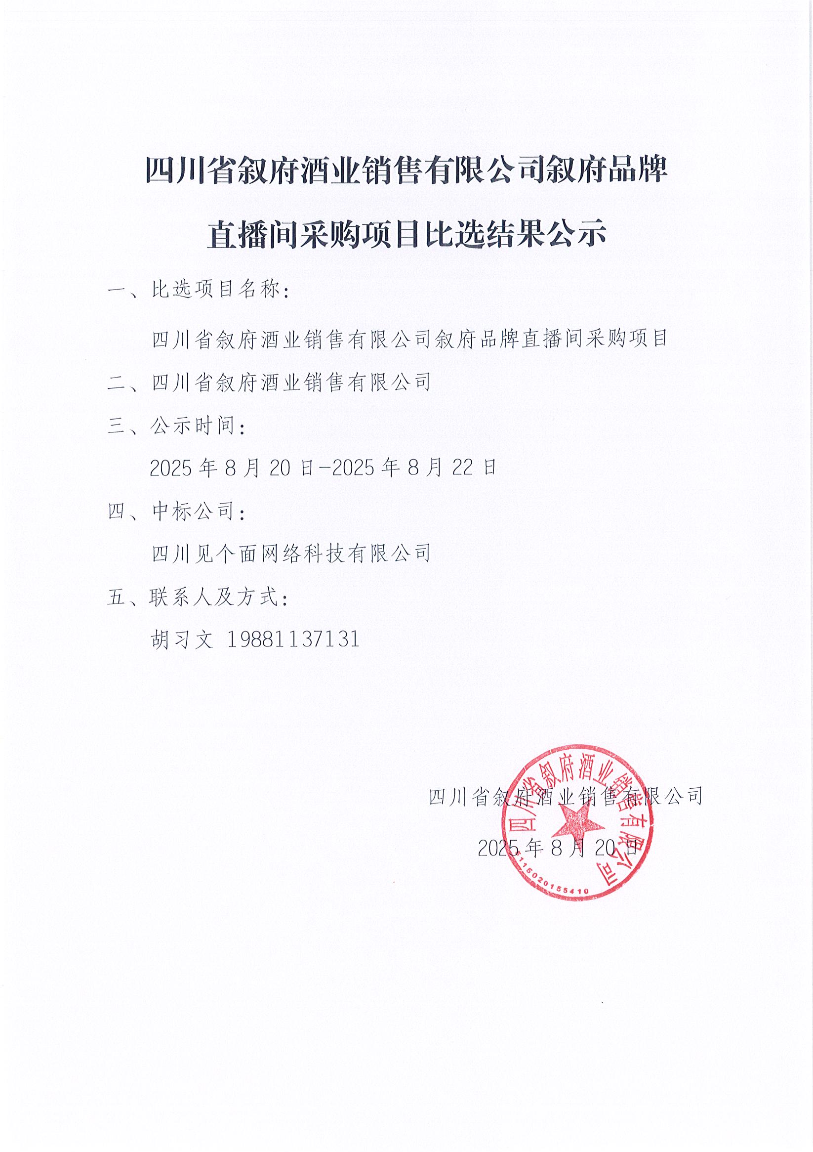 四川省敘府酒業(yè)銷售有限公司敘府品牌直播間采購項目比選結(jié)果公示公告