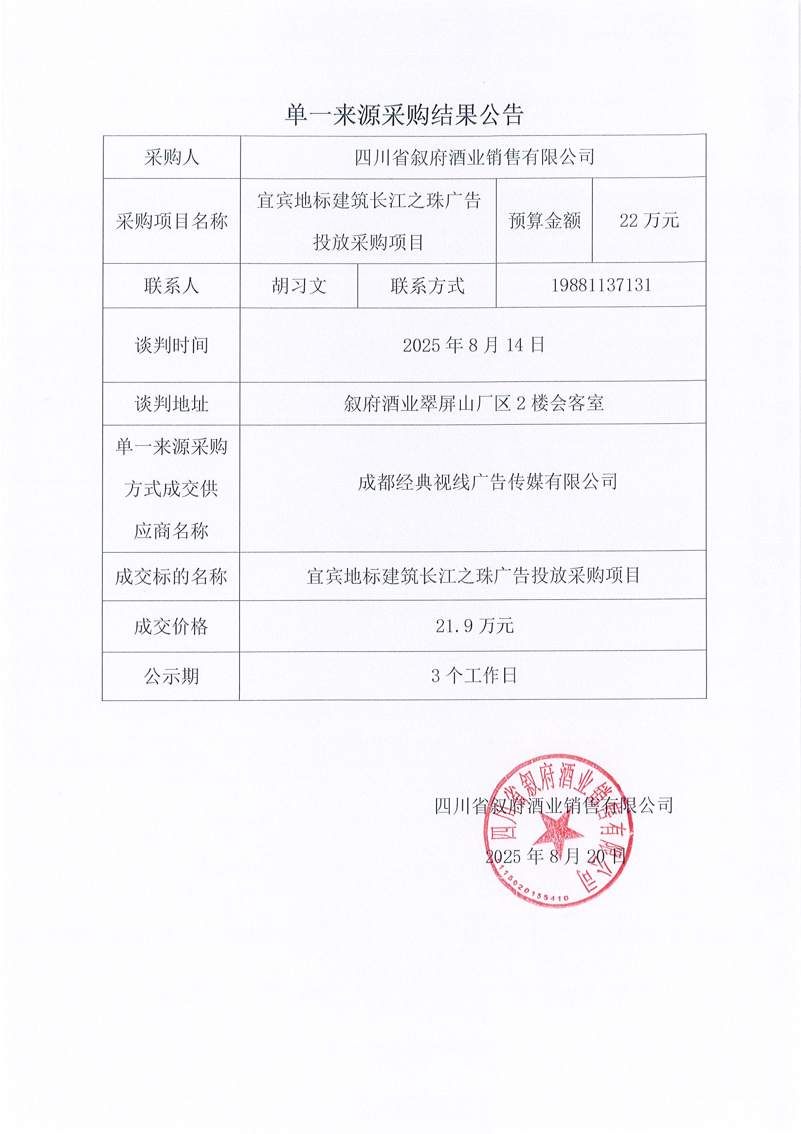 四川省敘府酒業(yè)銷售有限公司宜賓地標(biāo)建筑長江之珠廣告投放采購項目單一來源采購結(jié)果公告