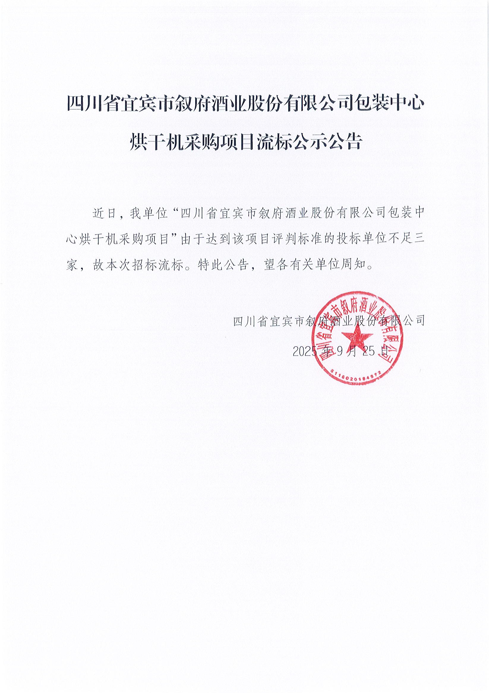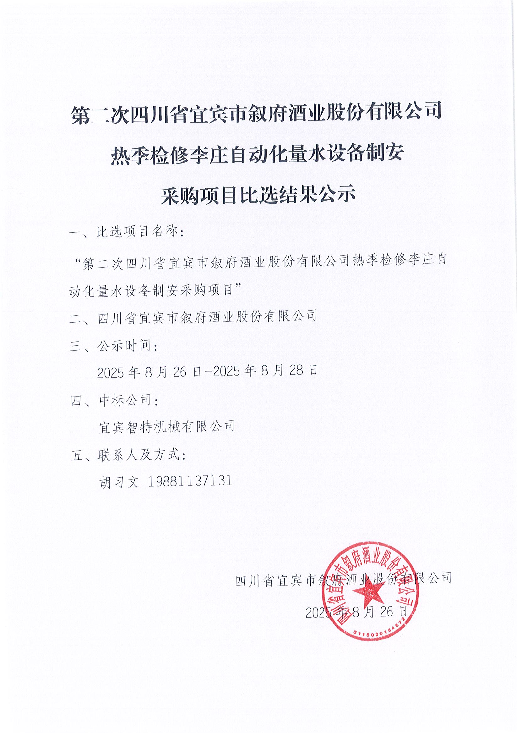 第二次四川省宜賓市敘府酒業(yè)股份有限公司熱季檢修李莊自動化量水設(shè)備制公告安采購項目比選結(jié)果公示
