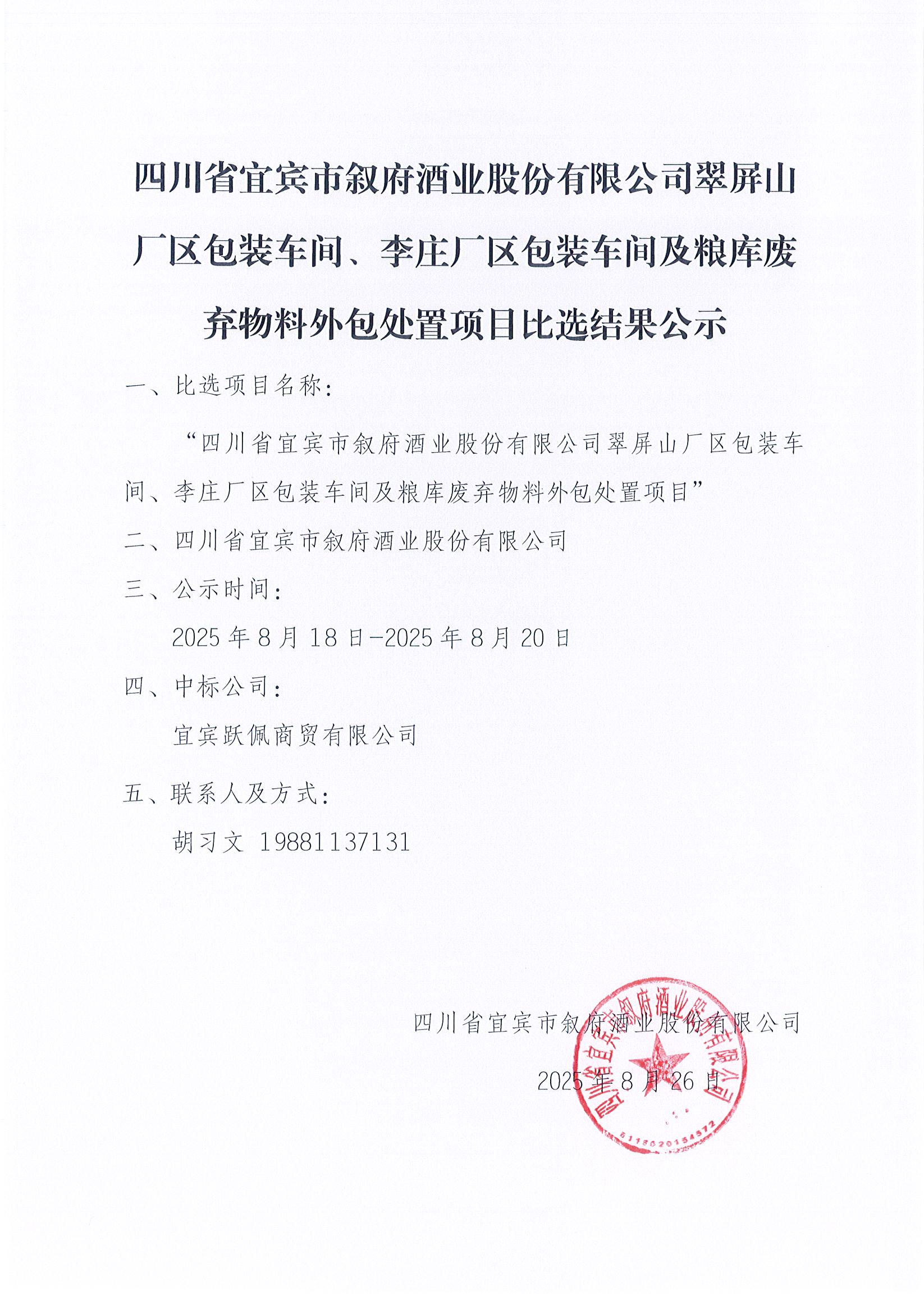 四川省宜賓市敘府酒業(yè)股份有限公司翠屏山廠區(qū)包裝車間、李莊廠區(qū)包裝車間及糧庫廢棄物料外包處置項目比選結(jié)果公示公告
