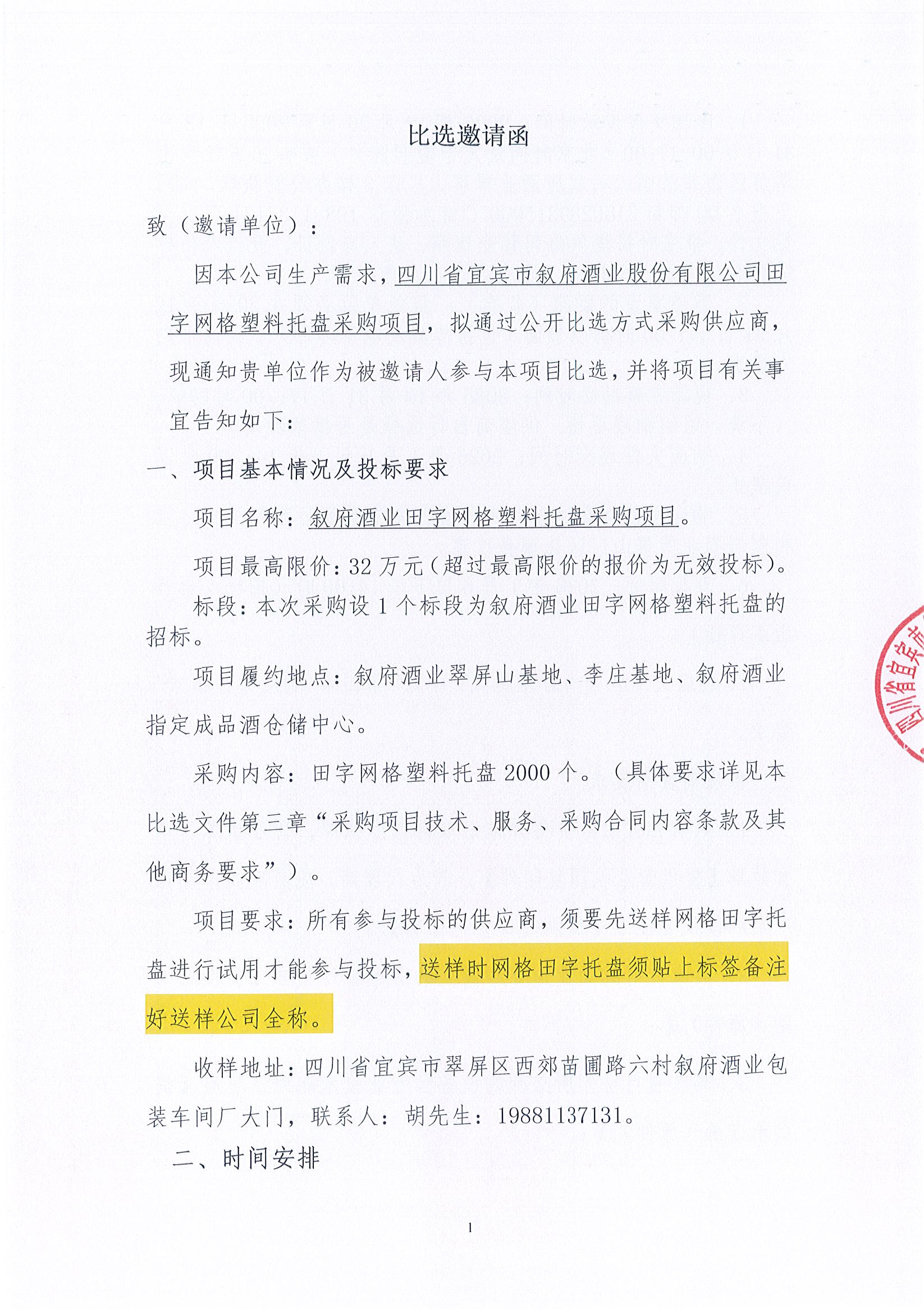 四川省宜賓市敘府酒業(yè)股份有限公司田字網(wǎng)格塑料托盤采購項目比選招標公告