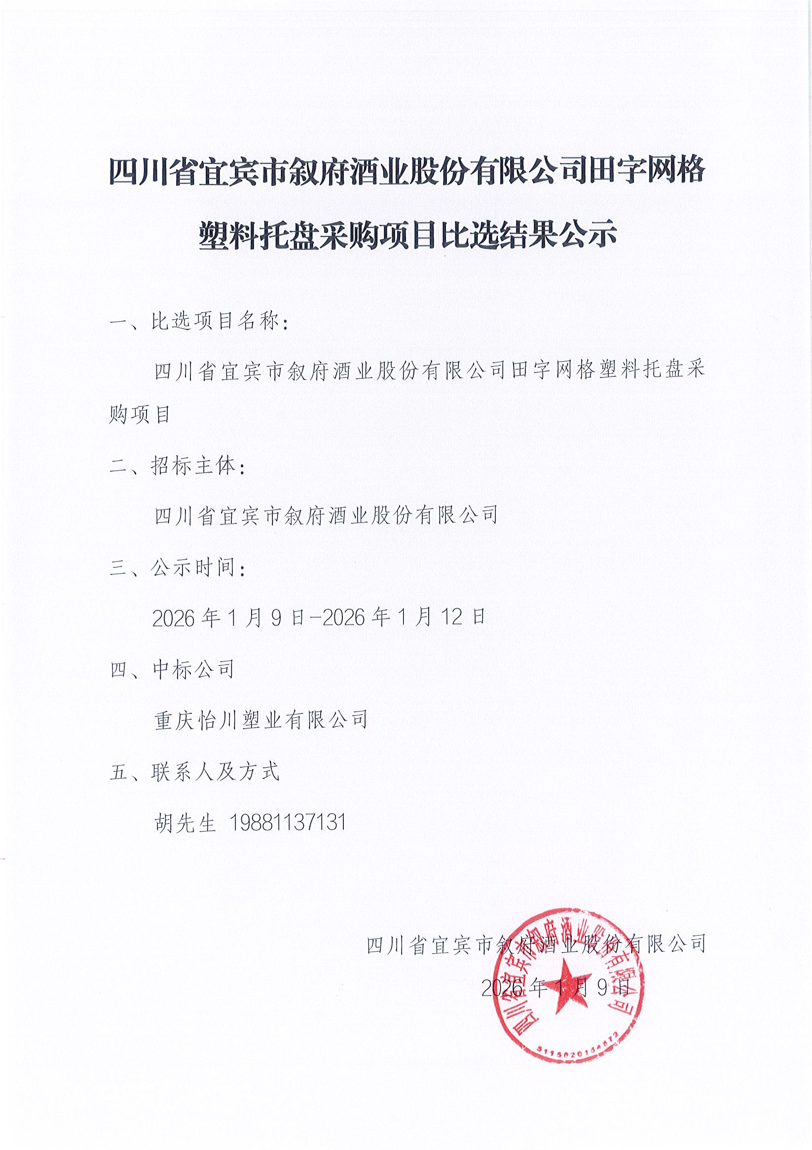 四川省宜賓市敘府酒業(yè)股份有限公司田字網(wǎng)格塑料托盤采購項目比選結(jié)果公示公告