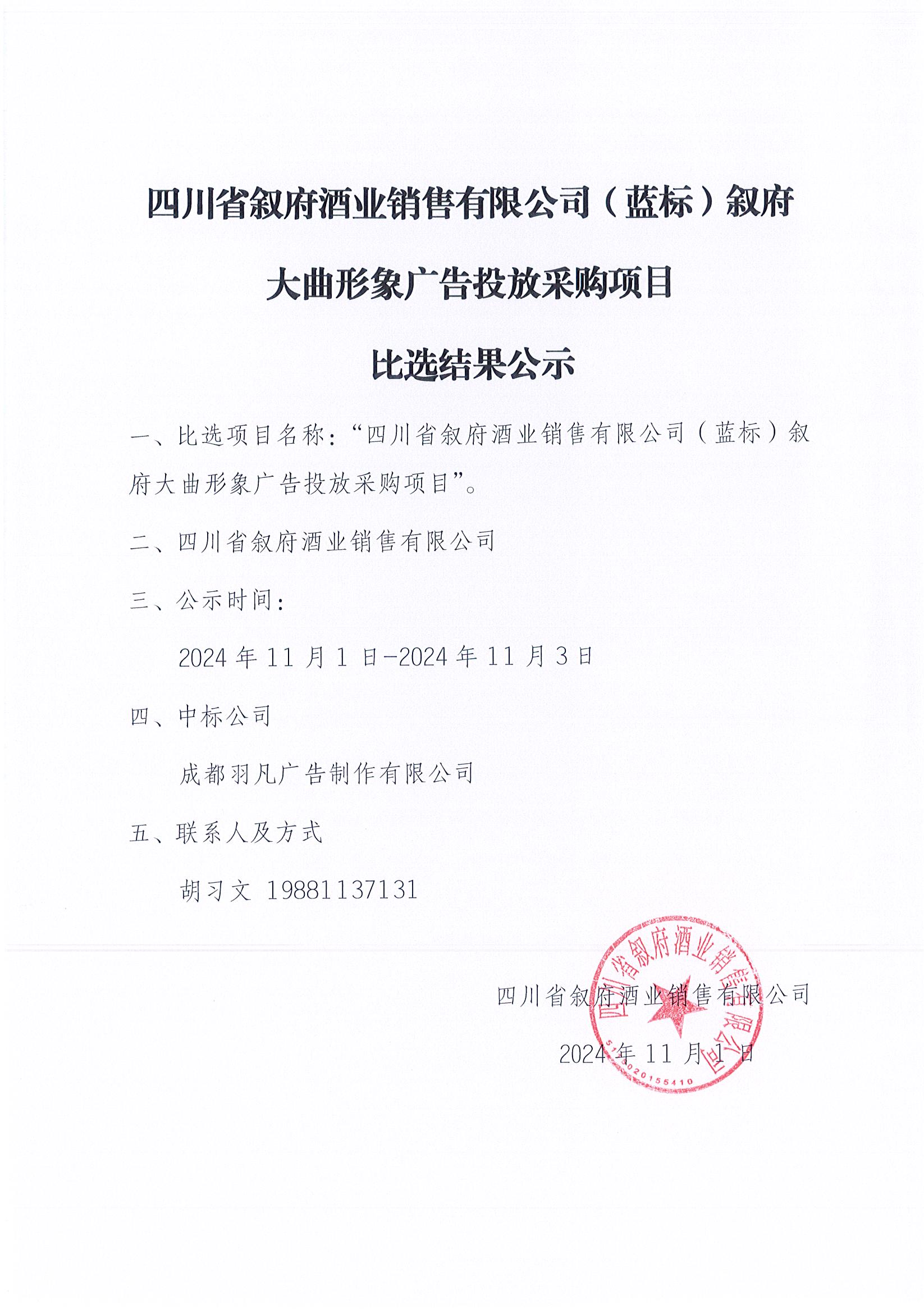 四川省敘府酒業(yè)銷售有限公司(藍標)敘府大曲形象廣告投放采購項目比選結(jié)果公示