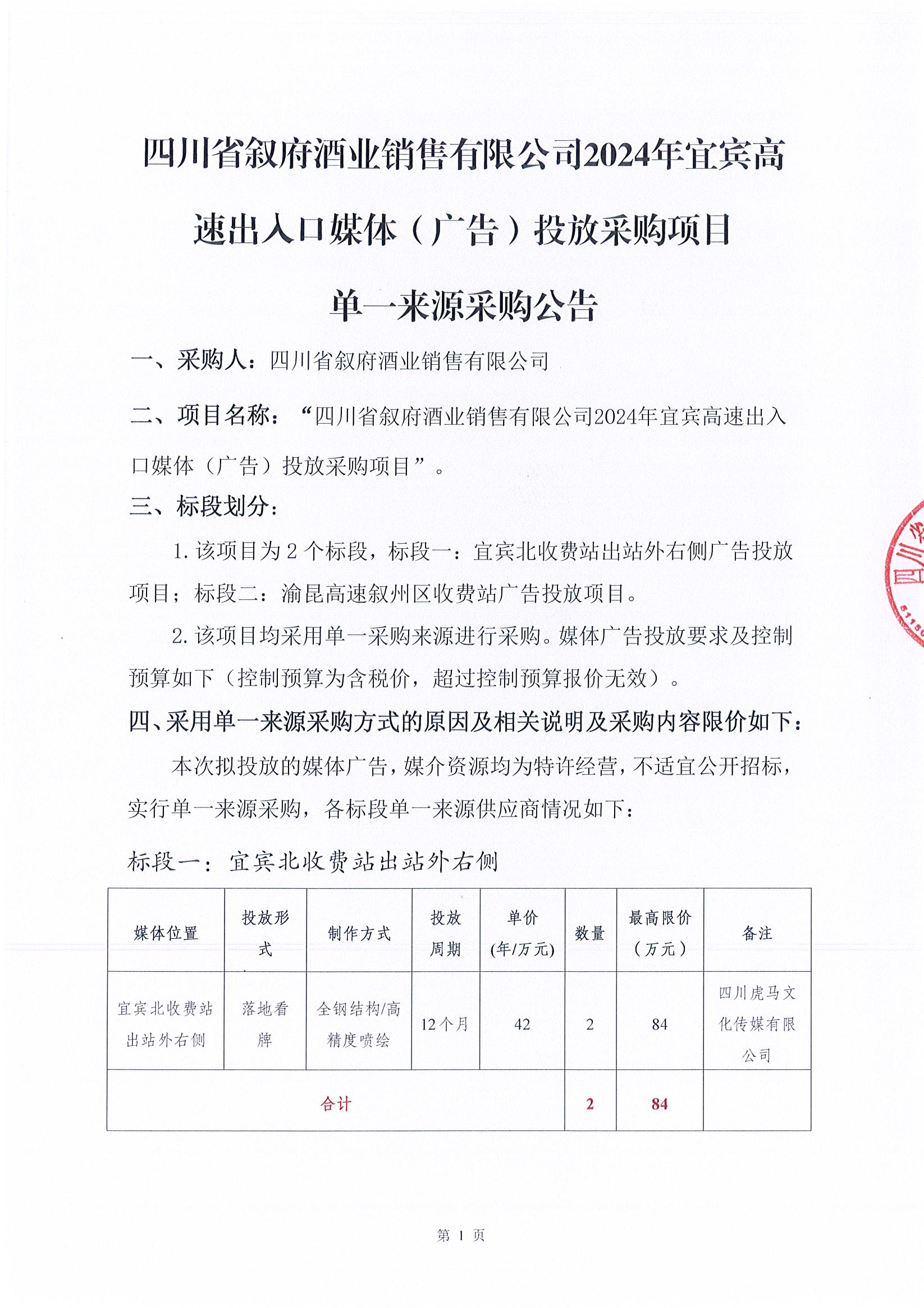 四川省敘府酒業(yè)銷售有限公司2024年宜賓高速出入口媒體(廣告)投放采購項目單一來源公示公告