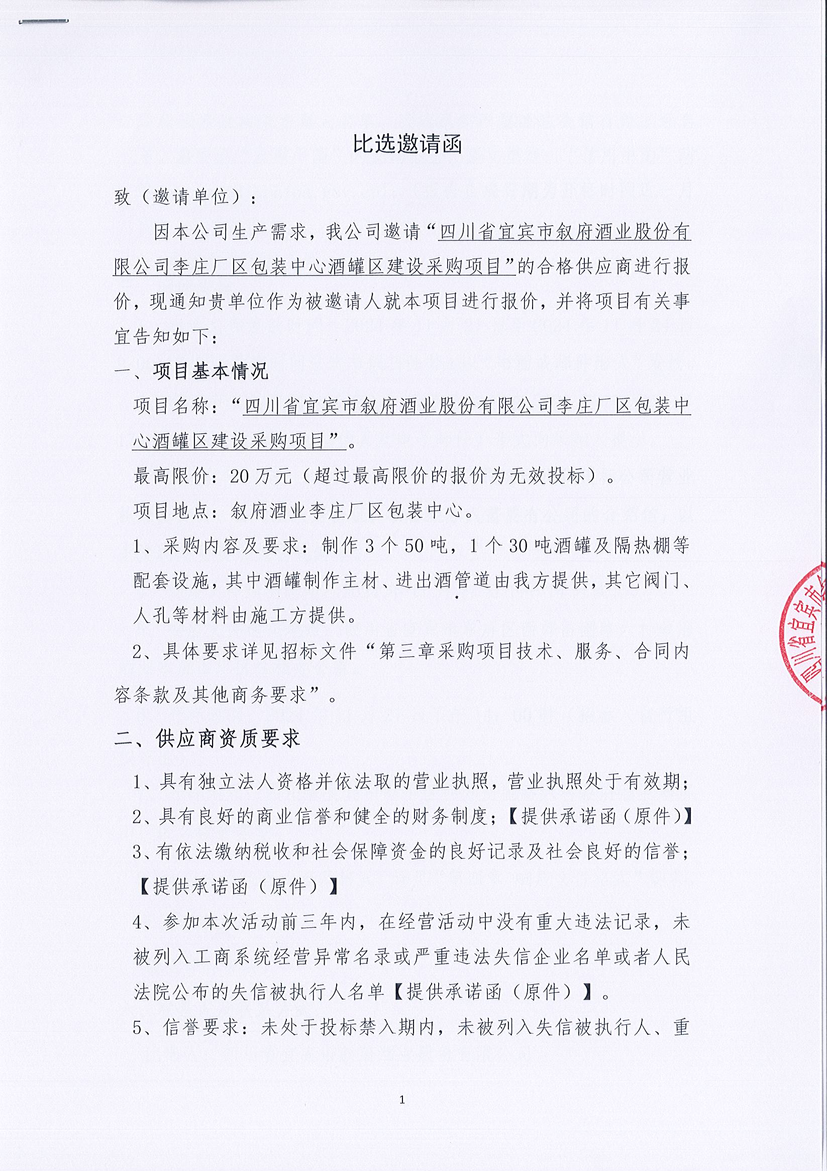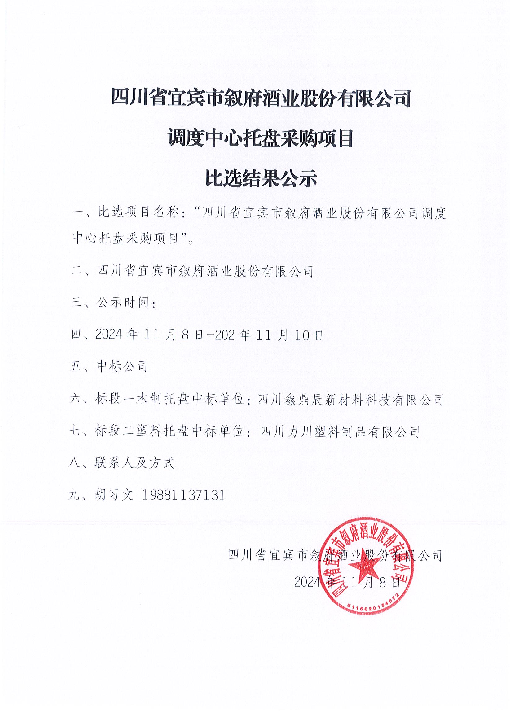 四川省宜賓市敘府酒業(yè)股份有限公司 調(diào)度中心托盤采購項目 比選結(jié)果公示