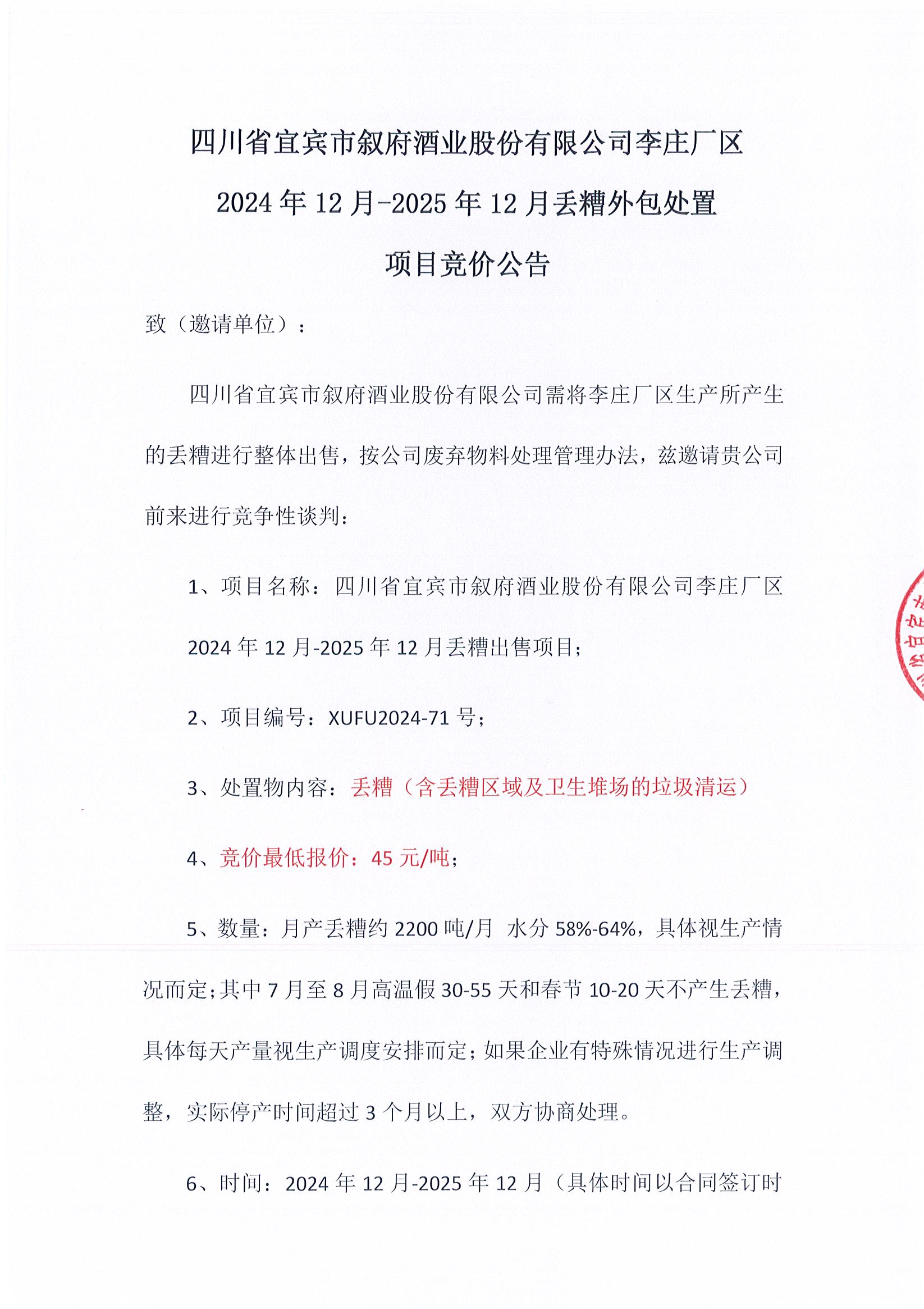 四川省宜賓市敘府酒業(yè)股份有限公司李莊廠區(qū) 2024年12月-2025年12月丟糟外包處置 項目競價公告