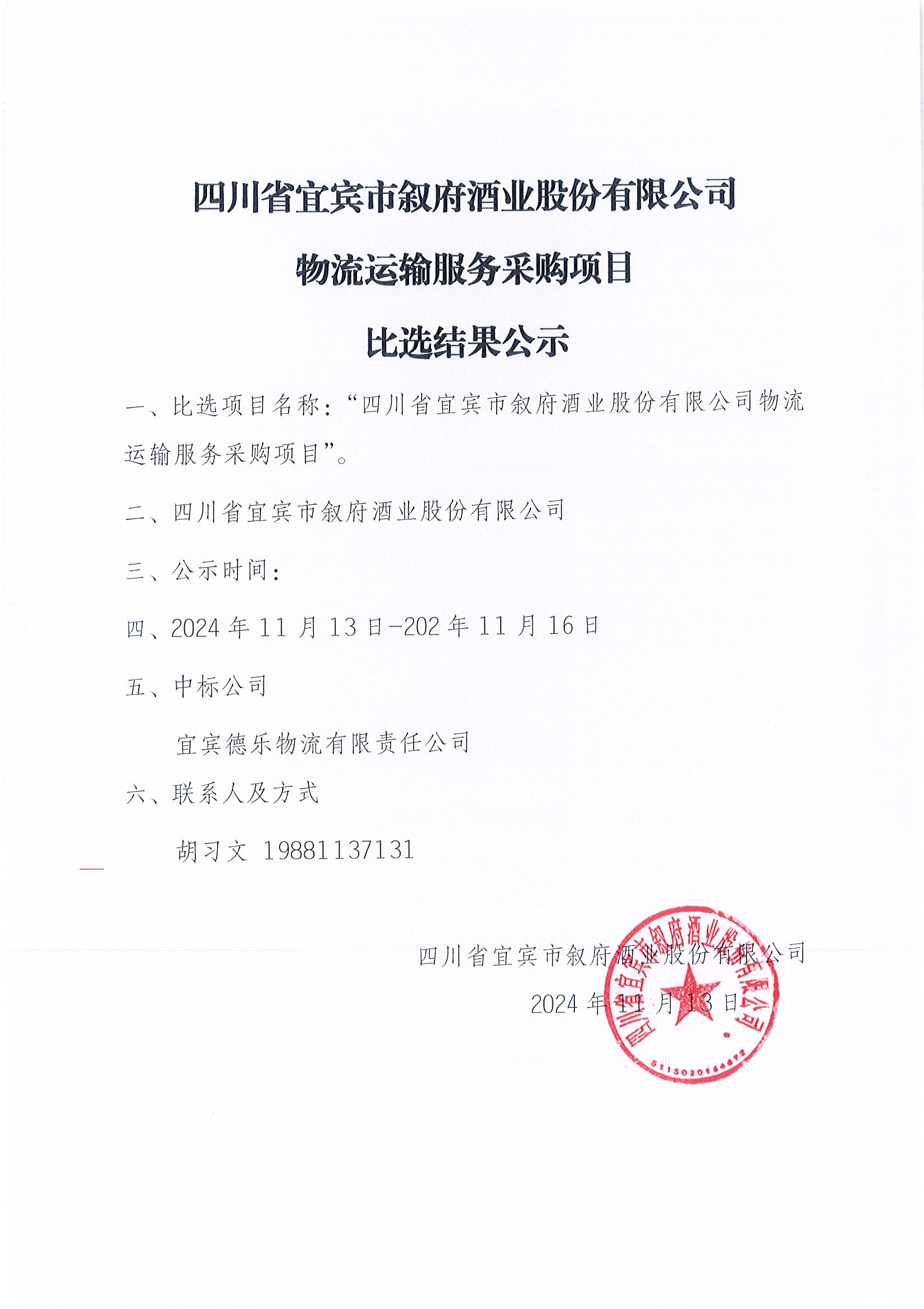四川省宜賓市敘府酒業(yè)股份有限公司物流運輸服務(wù)采購項目比選結(jié)果公示