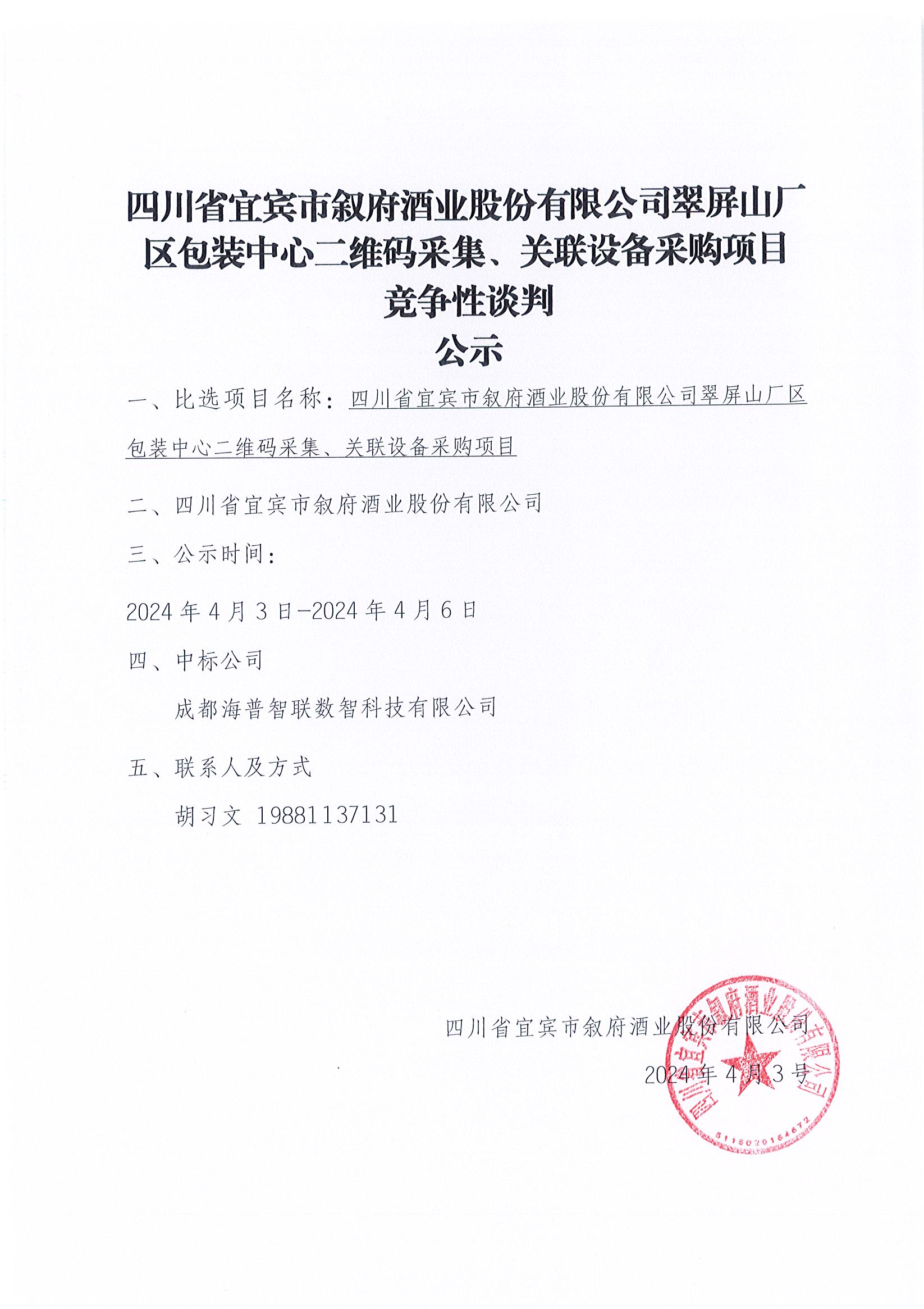四川省宜賓市敘府酒業(yè)股份有限公司翠屏山廠區(qū)包裝中心二維碼采集、關(guān)聯(lián)設(shè)備采購(gòu)項(xiàng)目 競(jìng)爭(zhēng)性談判中標(biāo) 結(jié)果公示