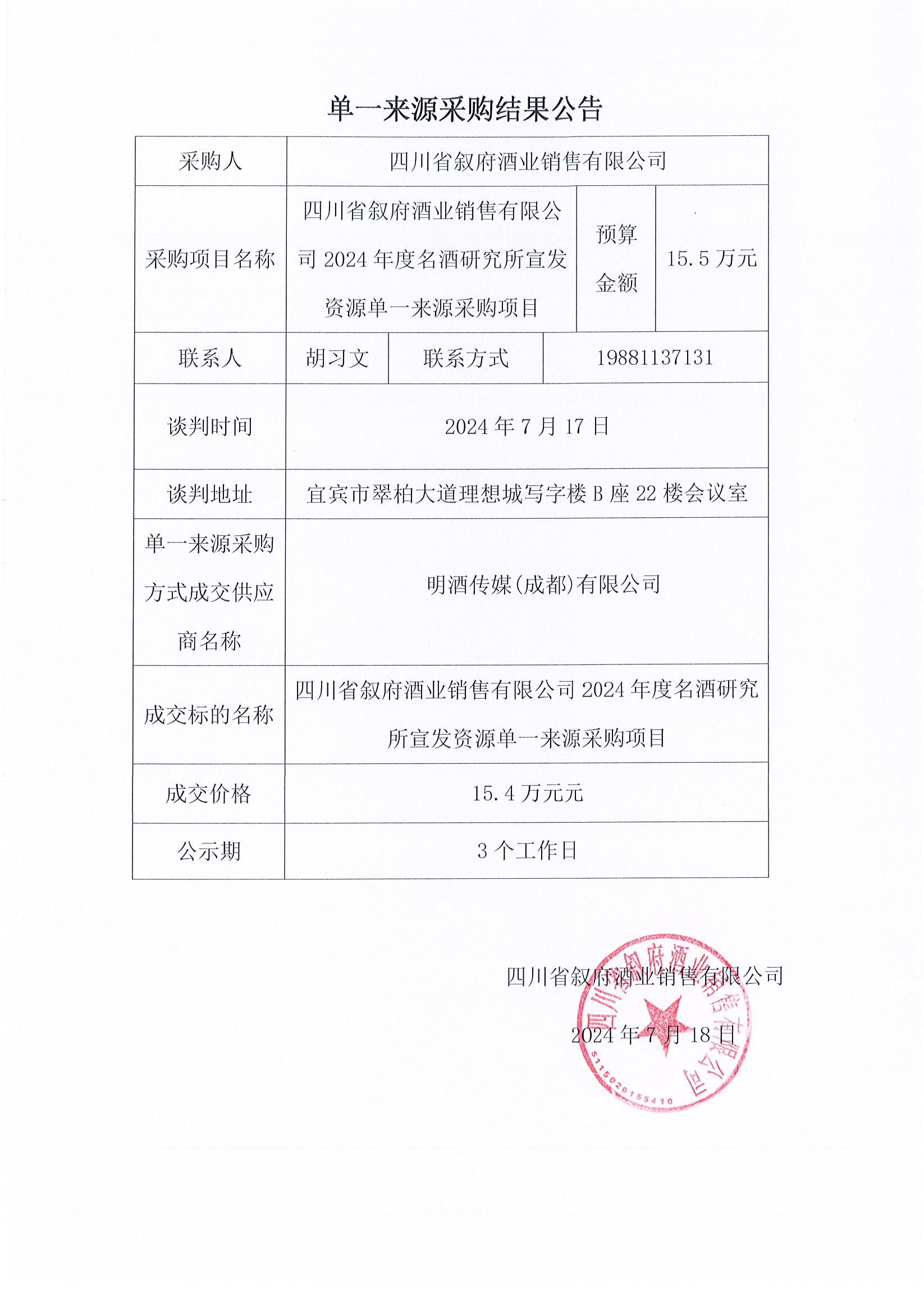 四川省敘府酒業(yè)銷(xiāo)售有限公司2024年度名酒研究所宣發(fā)資源單一來(lái)源采購(gòu)項(xiàng)目中標(biāo)結(jié)果公示公告
