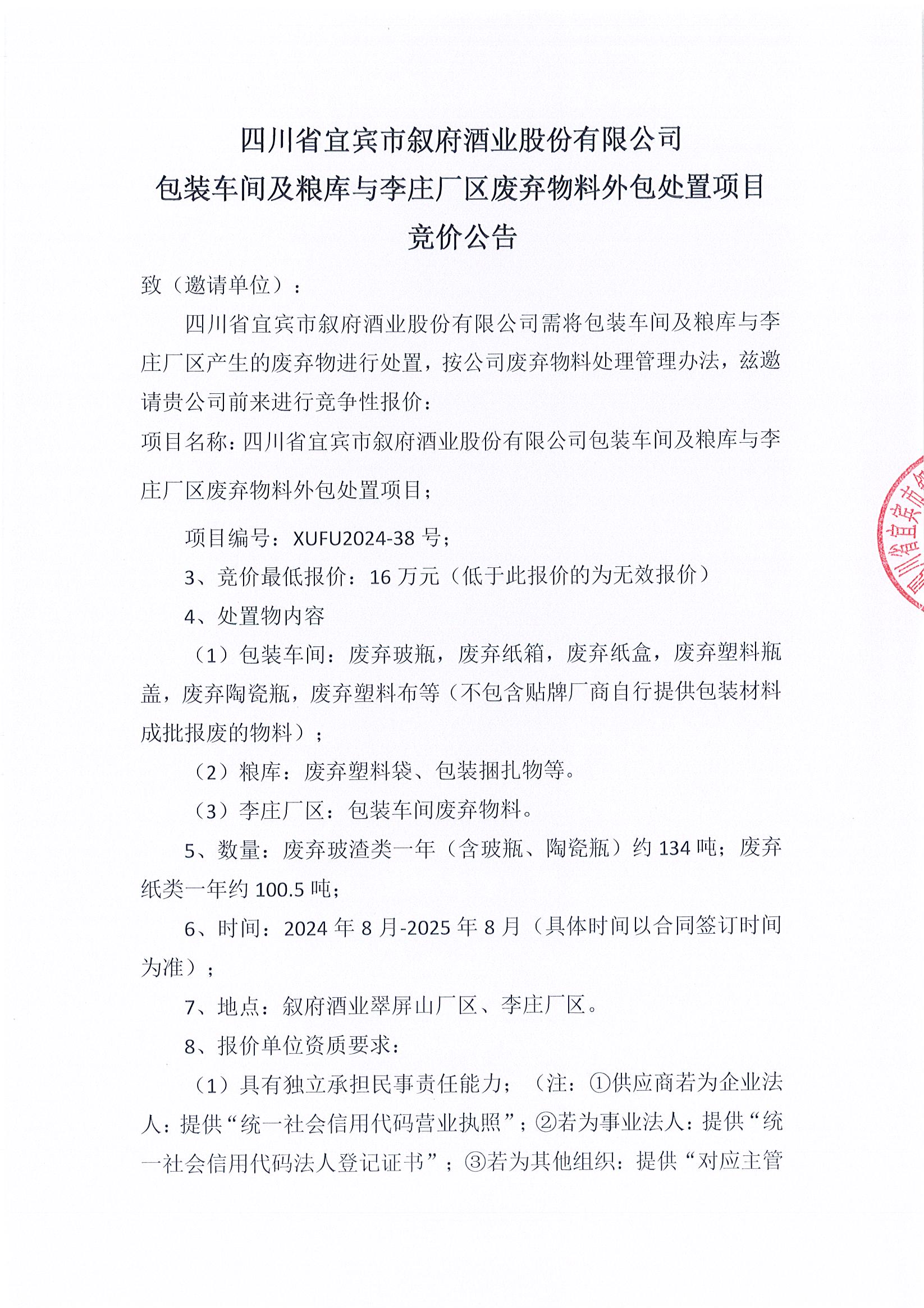 四川省宜賓市敘府酒業(yè)股份有限公司 包裝車(chē)間及糧庫(kù)與李莊廠區(qū)廢棄物料外包處置項(xiàng)目 競(jìng)價(jià)公告