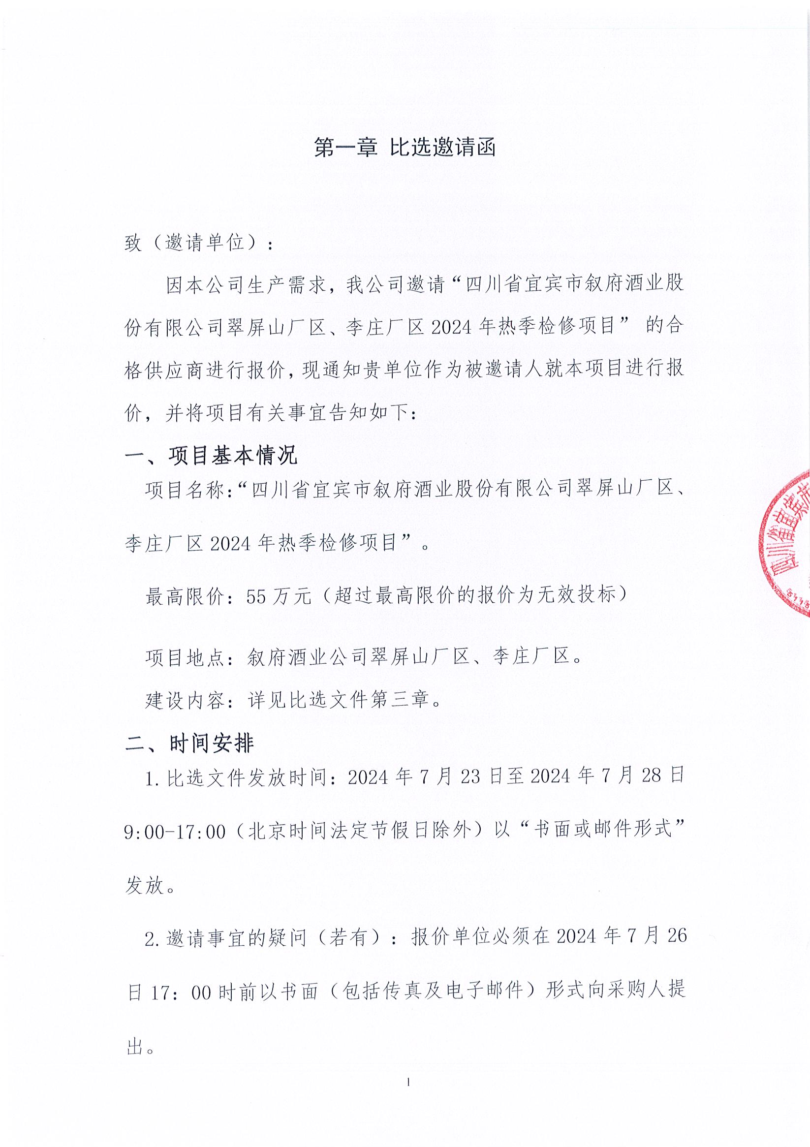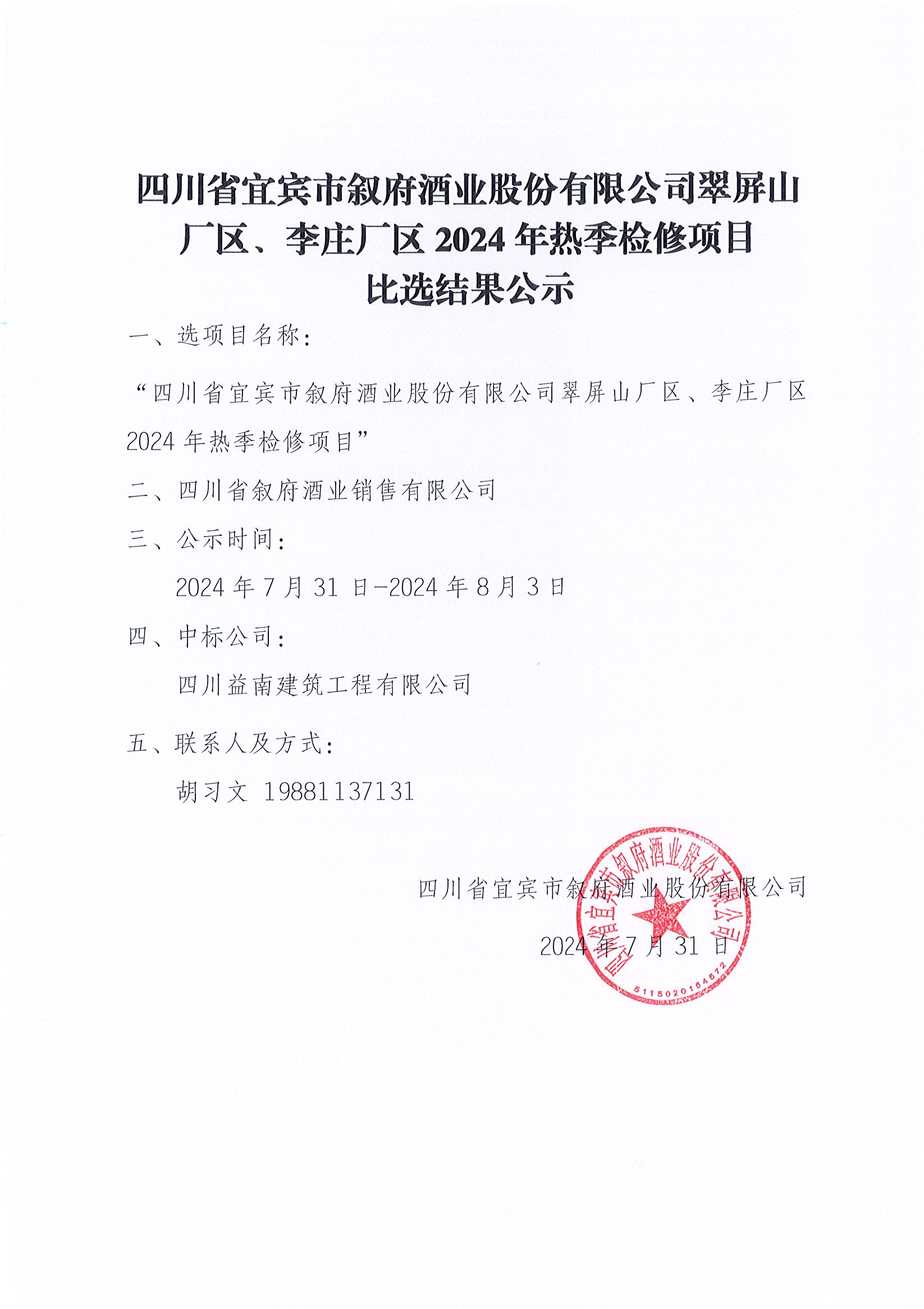 四川省宜賓市敘府酒業(yè)股份有限公司翠屏山廠區(qū)、李莊廠區(qū)2024年熱季檢修項(xiàng)目公開(kāi)比選公示公告