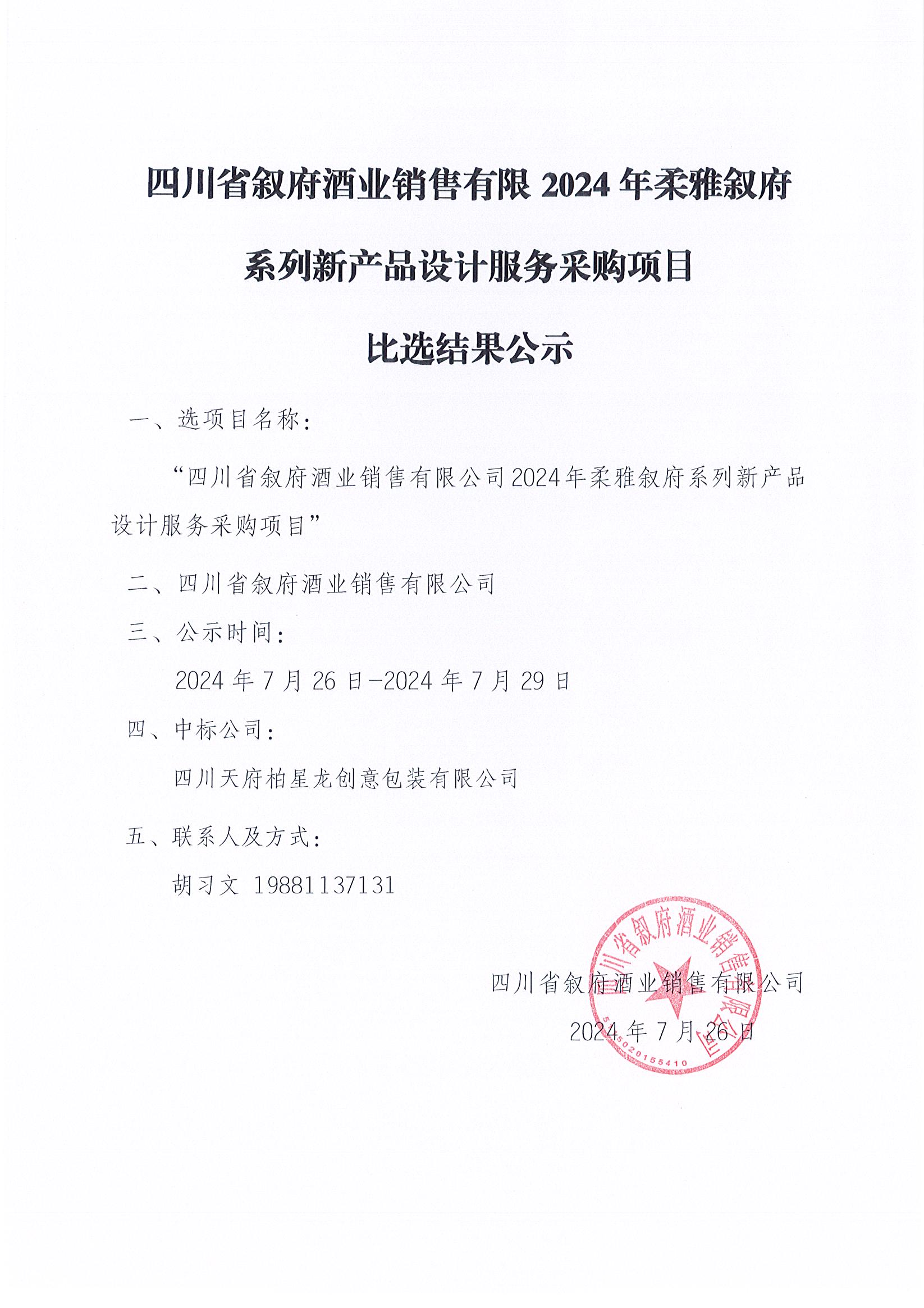 四川省敘府酒業(yè)銷(xiāo)售有限公司 2024年柔雅敘府系列新產(chǎn)品設(shè)計(jì)服務(wù)采購(gòu)項(xiàng)目比選結(jié)果公示公告