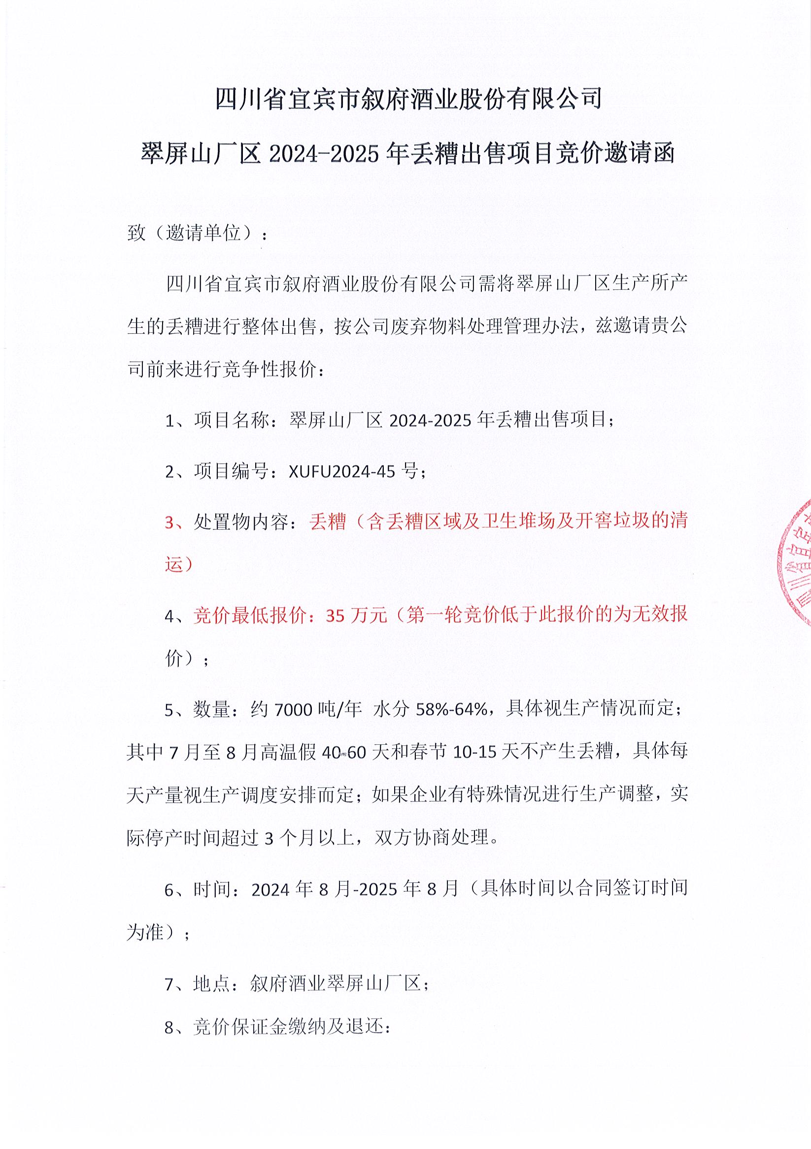四川省宜賓市敘府酒業(yè)股份有限公司 翠屏山廠區(qū)2024-2025年丟糟出售項(xiàng)目競(jìng)價(jià)邀請(qǐng)函公示公告