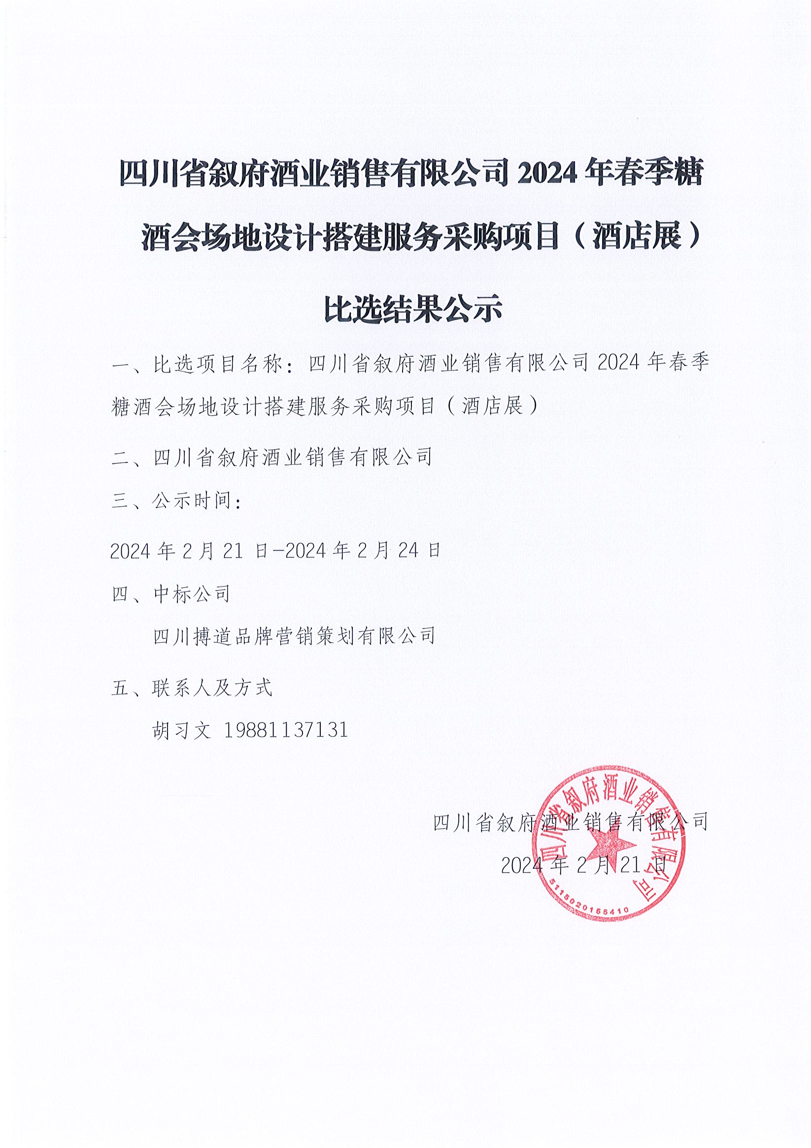 四川省敘府酒業(yè)銷售有限公司2024年春季糖酒會(huì)場(chǎng)地設(shè)計(jì)搭建服務(wù)采購(gòu)項(xiàng)目(酒店展)搭建中標(biāo)結(jié)果公示公告
