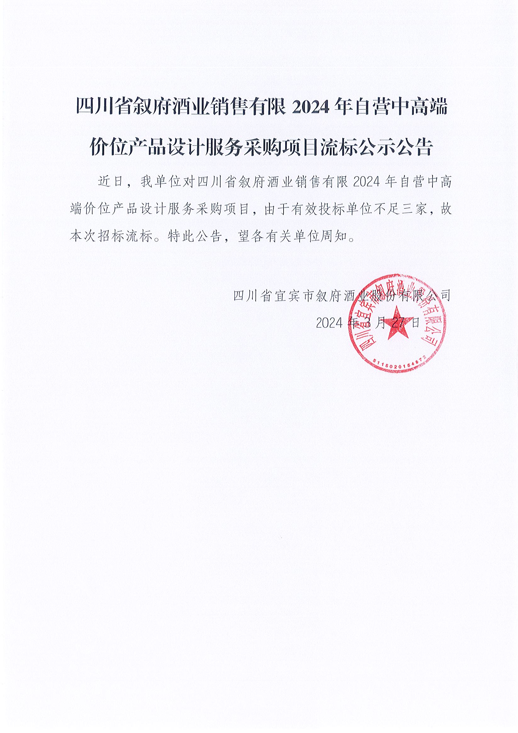 四川省敘府酒業(yè)銷售有限公司 2024年自營(yíng)中高端價(jià)位產(chǎn)品設(shè)計(jì) 服務(wù)采購(gòu)項(xiàng)目流標(biāo)公示公告