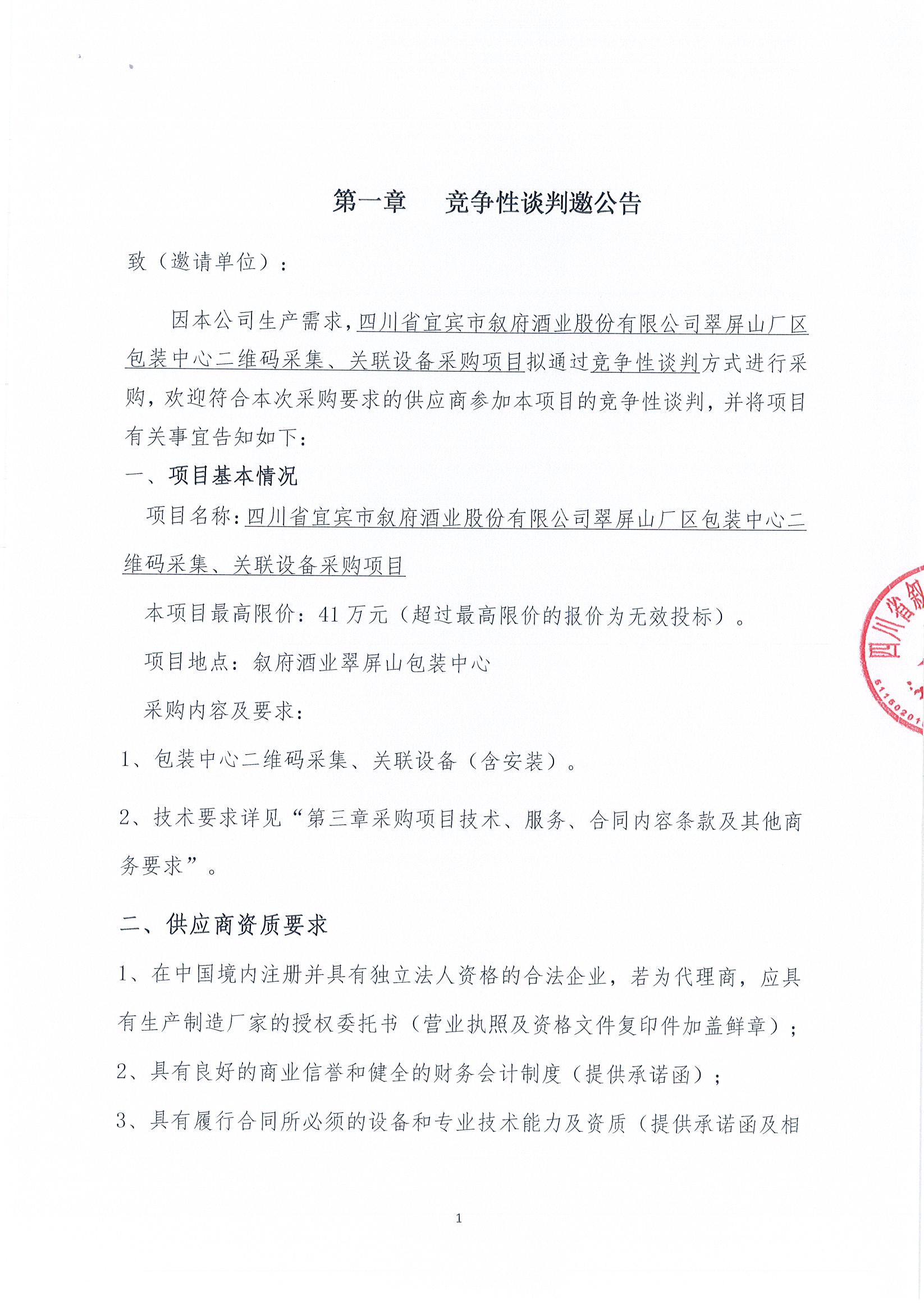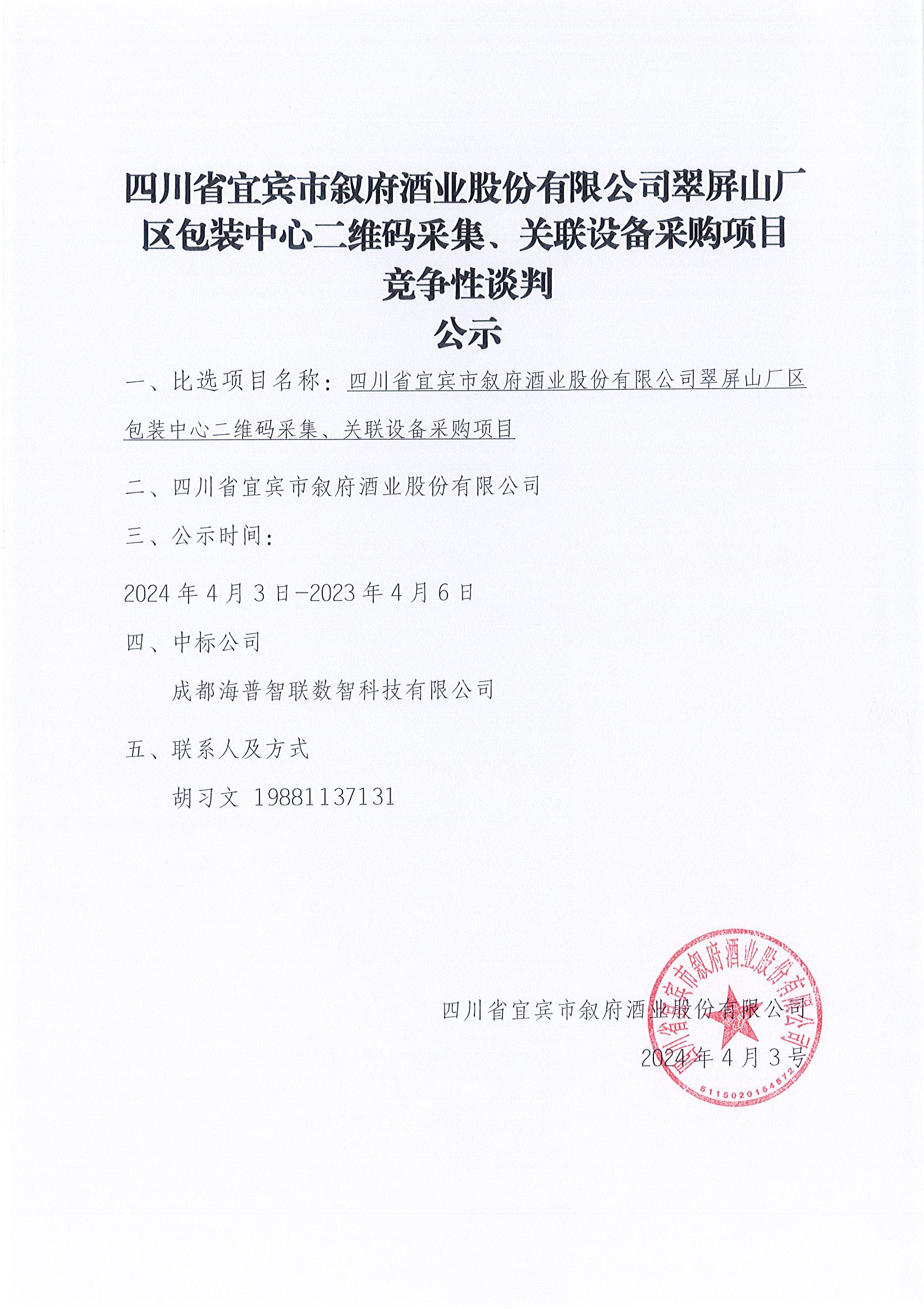 四川省宜賓市敘府酒業(yè)股份有限公司翠屏山廠區(qū)包裝中心二維碼采集、關(guān)聯(lián)設(shè)備采購(gòu)項(xiàng)目公示公告