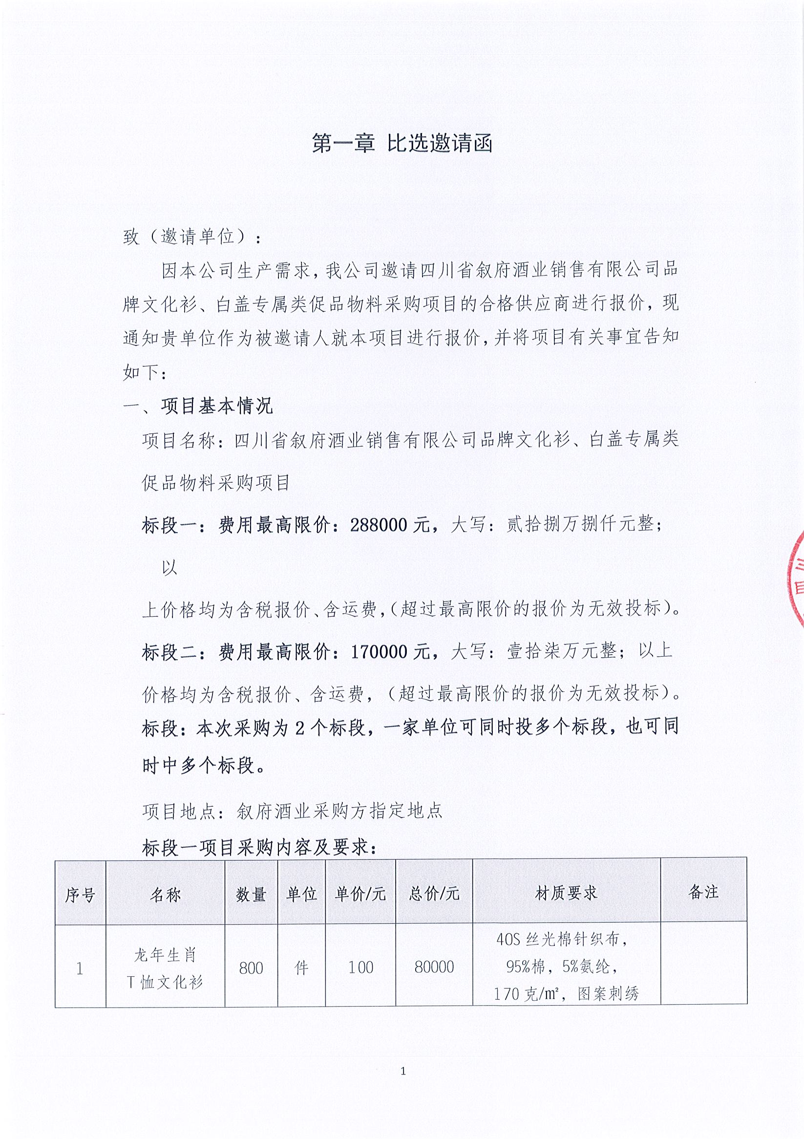 四川省敘府酒業(yè)銷售有限公司品牌文化衫、白蓋專屬類促品物料采購(gòu)項(xiàng)目比選公告