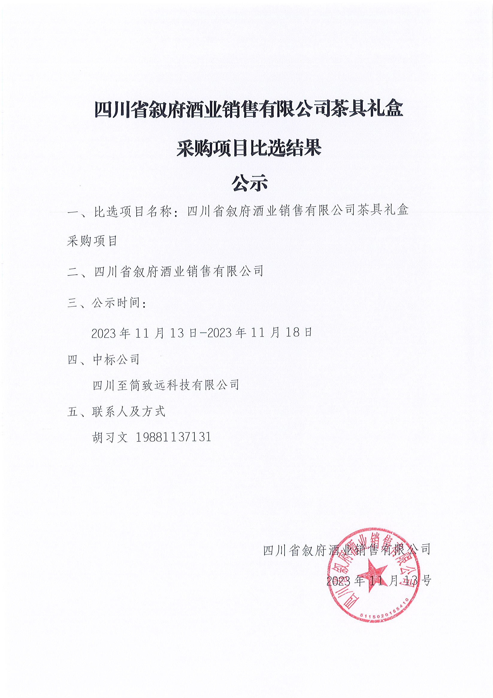 四川省敘府酒業(yè)銷售有限公司茶具禮盒采購項目中標結果公示