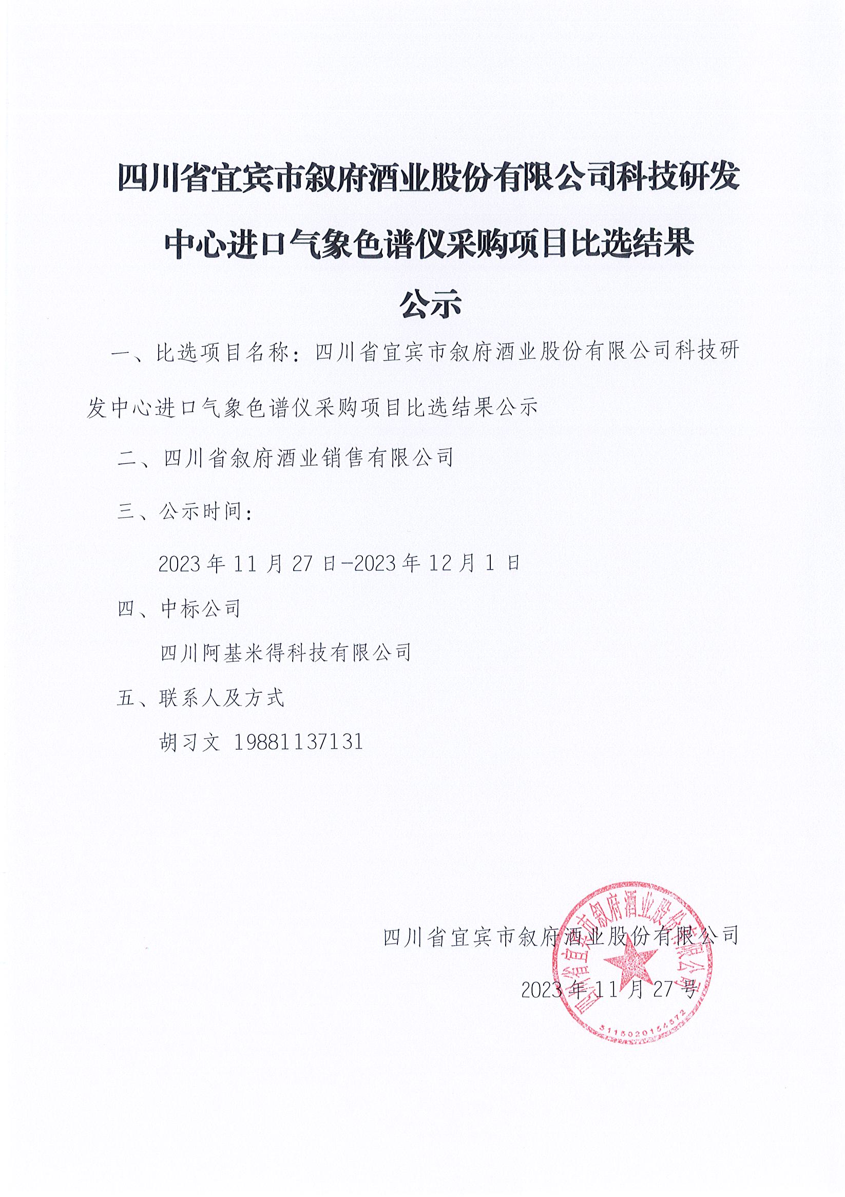 四川省宜賓市敘府酒業(yè)股份有限公司科技研發(fā)中心進口氣相色譜儀采購項目--開標結果公告