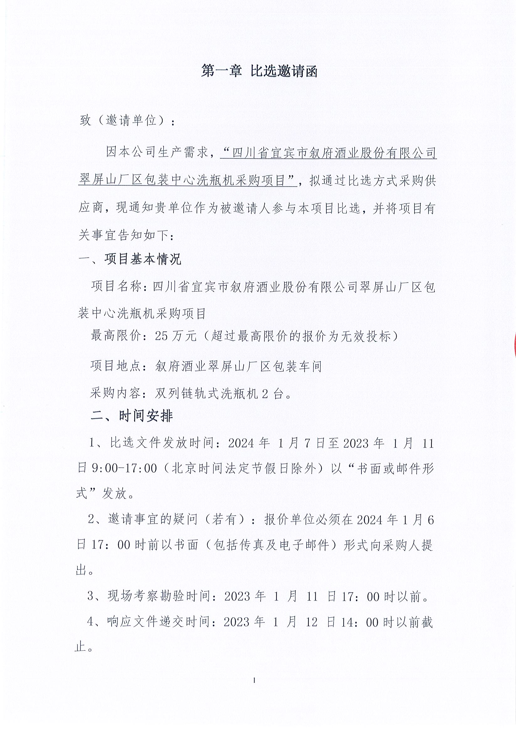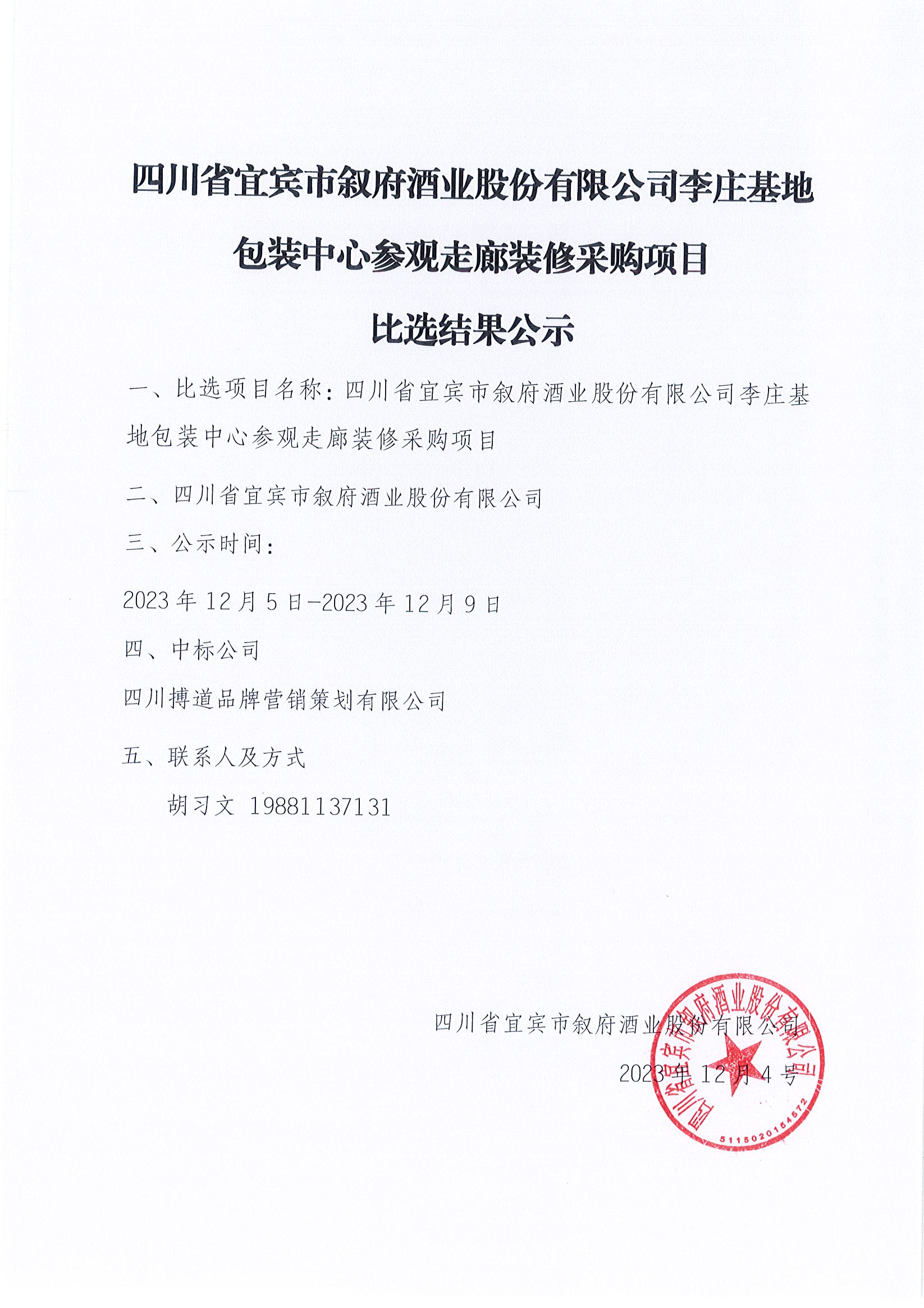 四川省宜賓市敘府酒業(yè)股份有限公司李莊基地包裝中心參觀走廊裝修采購項目 比選結果公示