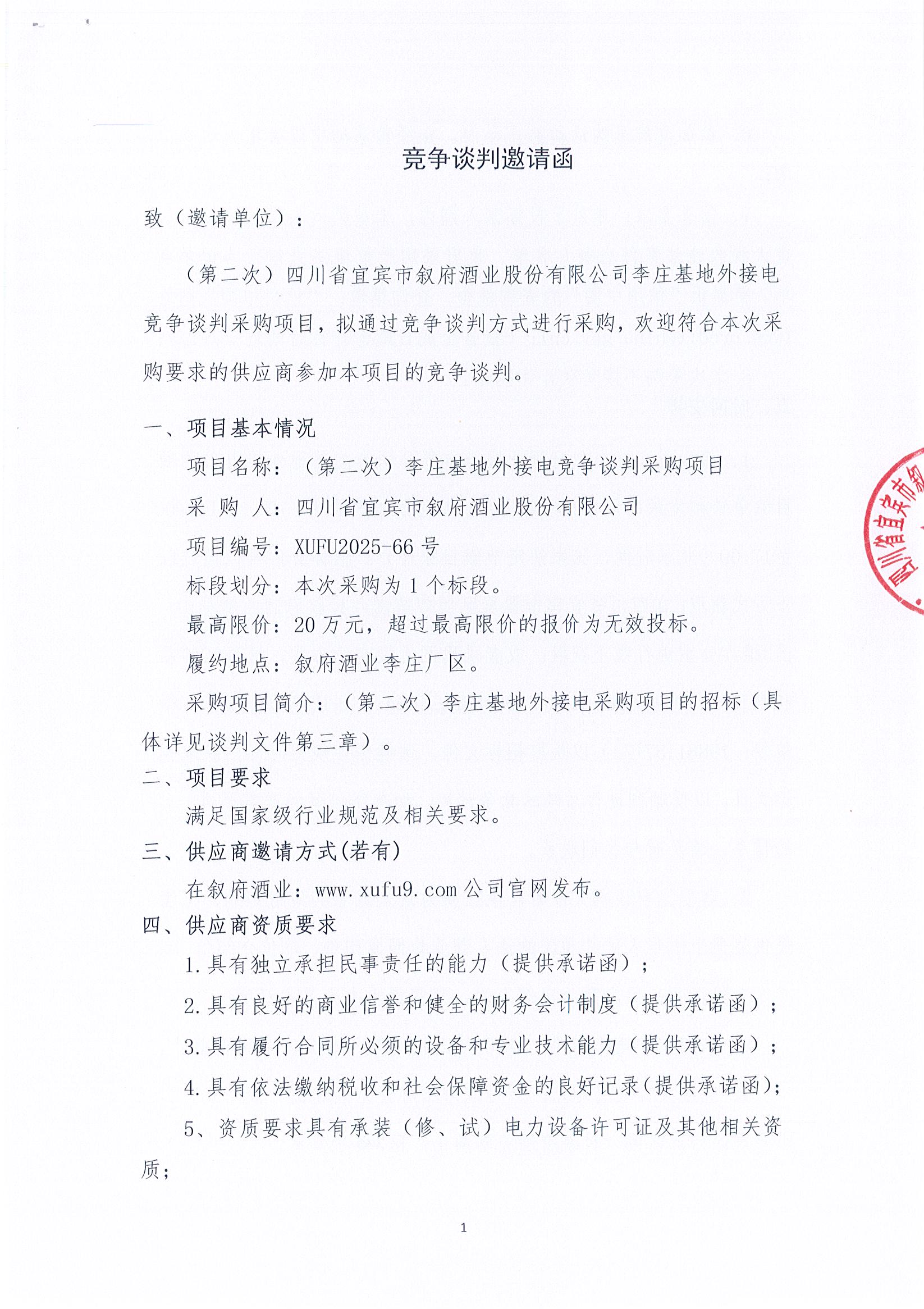 (第二次)四川省宜賓市敘府酒業(yè)股份有限公司李莊基地外接電競爭談判采購項目比選招標公告