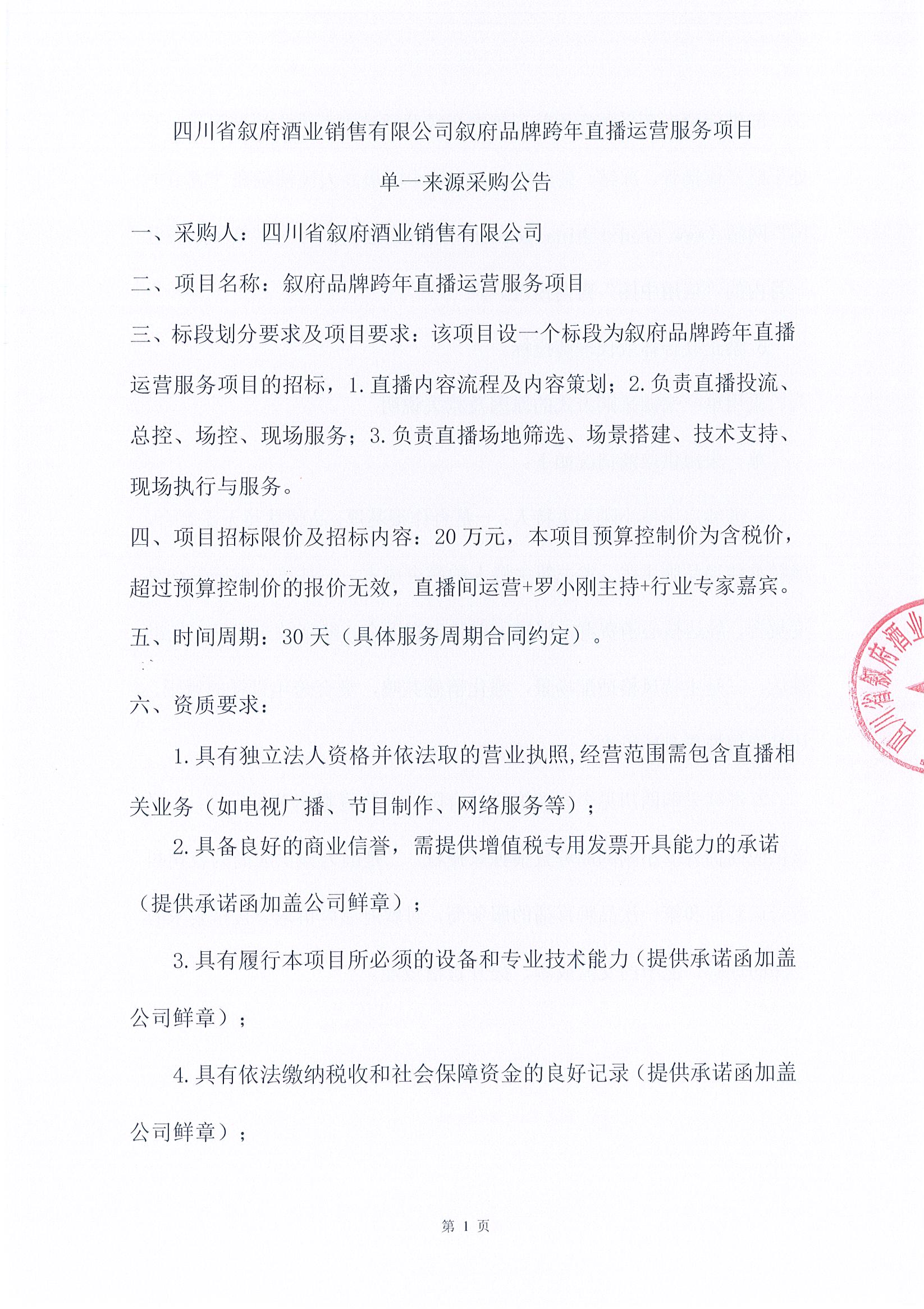 四川省敘府酒業(yè)銷售有限公司敘府品牌跨年直播運營服務項目單一來源招標公告