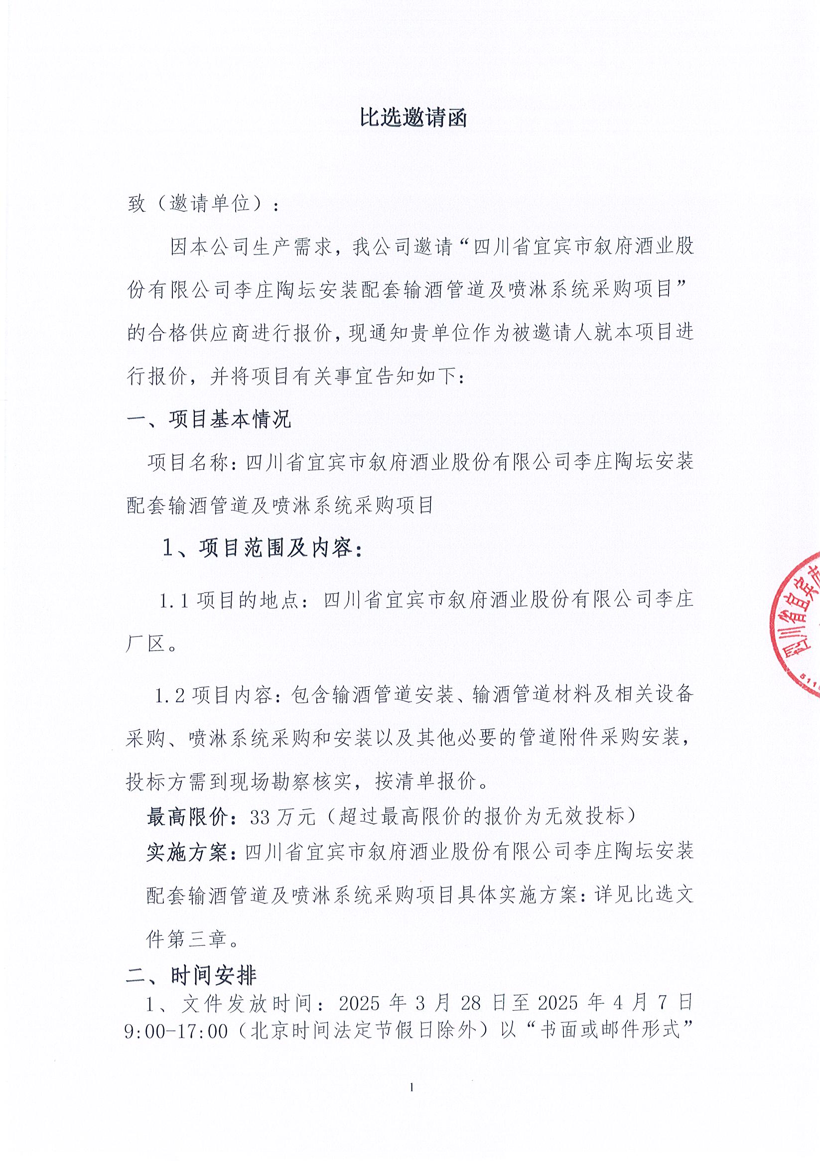 四川省宜賓市敘府酒業(yè)股份有限公司李莊陶壇安裝配套輸酒管道及噴淋系統(tǒng)采購(gòu)項(xiàng)目比選公示公告