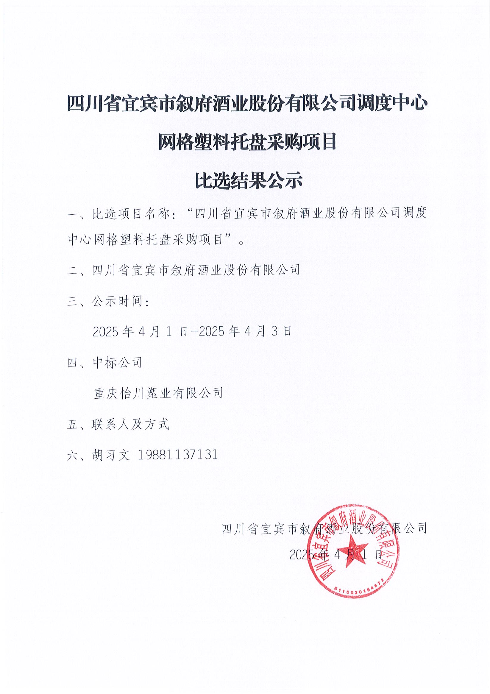 四川省宜賓市敘府酒業(yè)股份有限公司調(diào)度中心網(wǎng)格塑料托盤(pán)采購(gòu)項(xiàng)目公開(kāi)比選結(jié)果公示