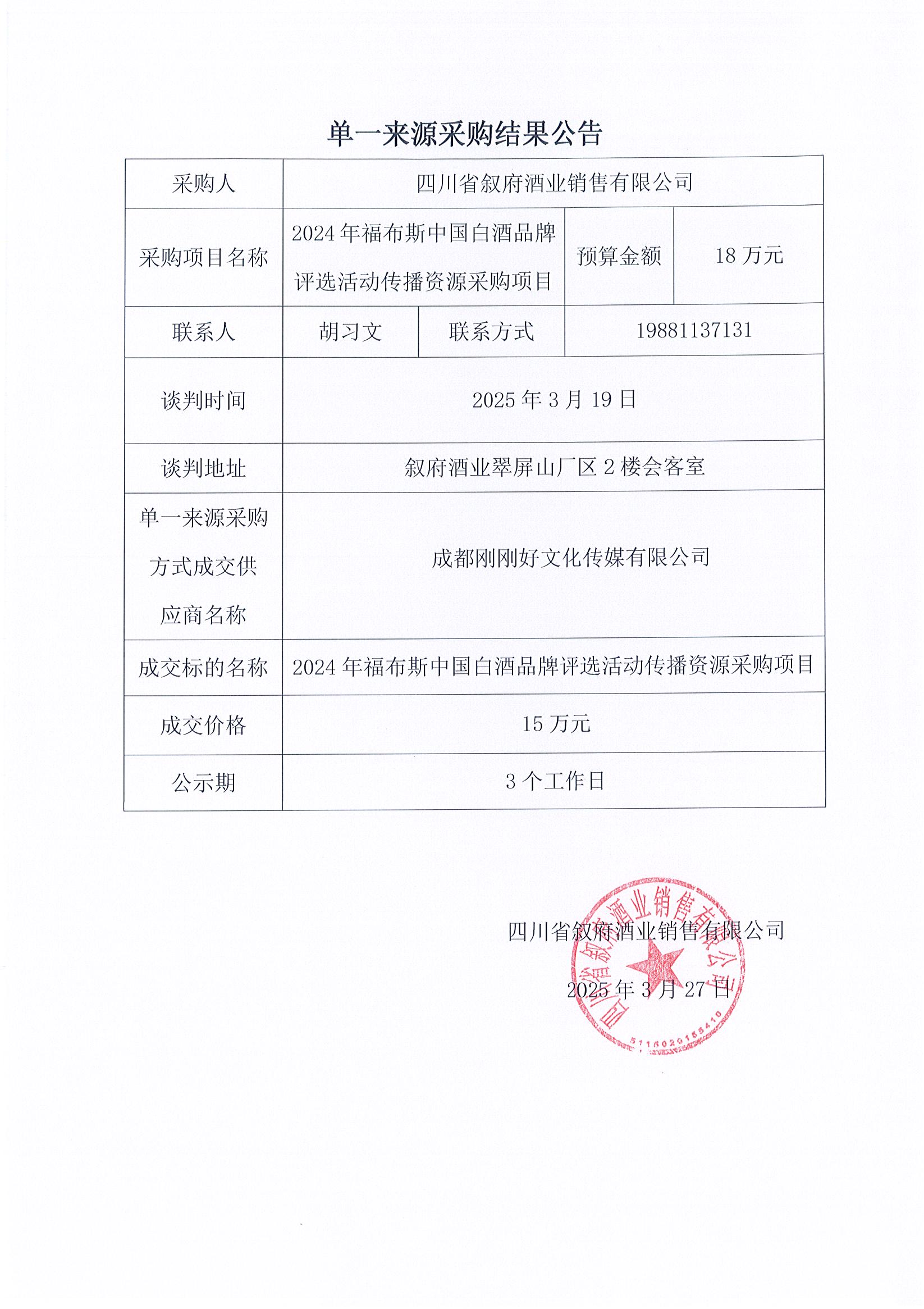 四川省敘府酒業(yè)銷(xiāo)售有限公司2024年福布斯中國(guó)白酒品牌評(píng)選活動(dòng)傳播資源采購(gòu)項(xiàng)目單一來(lái)源結(jié)果公示