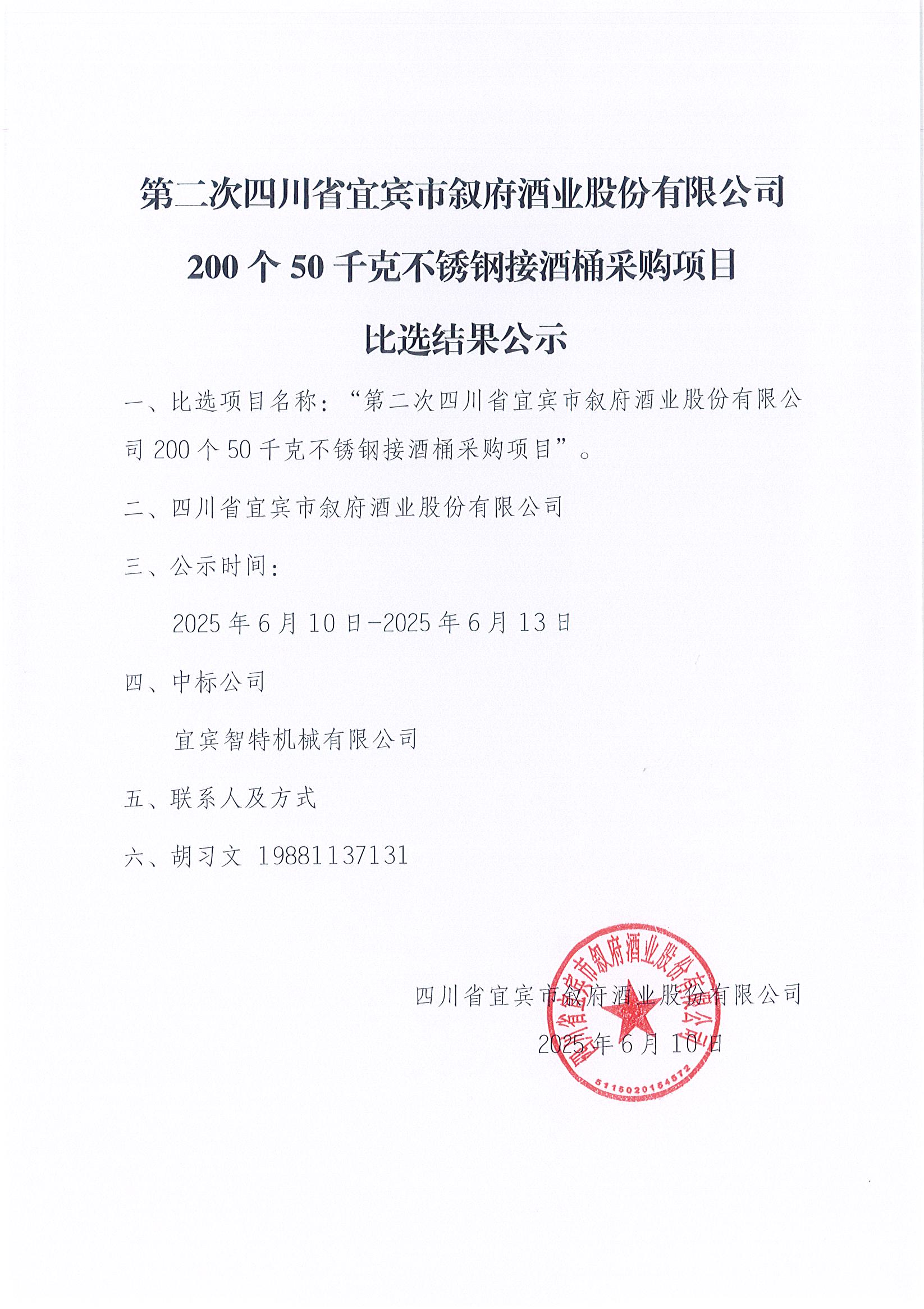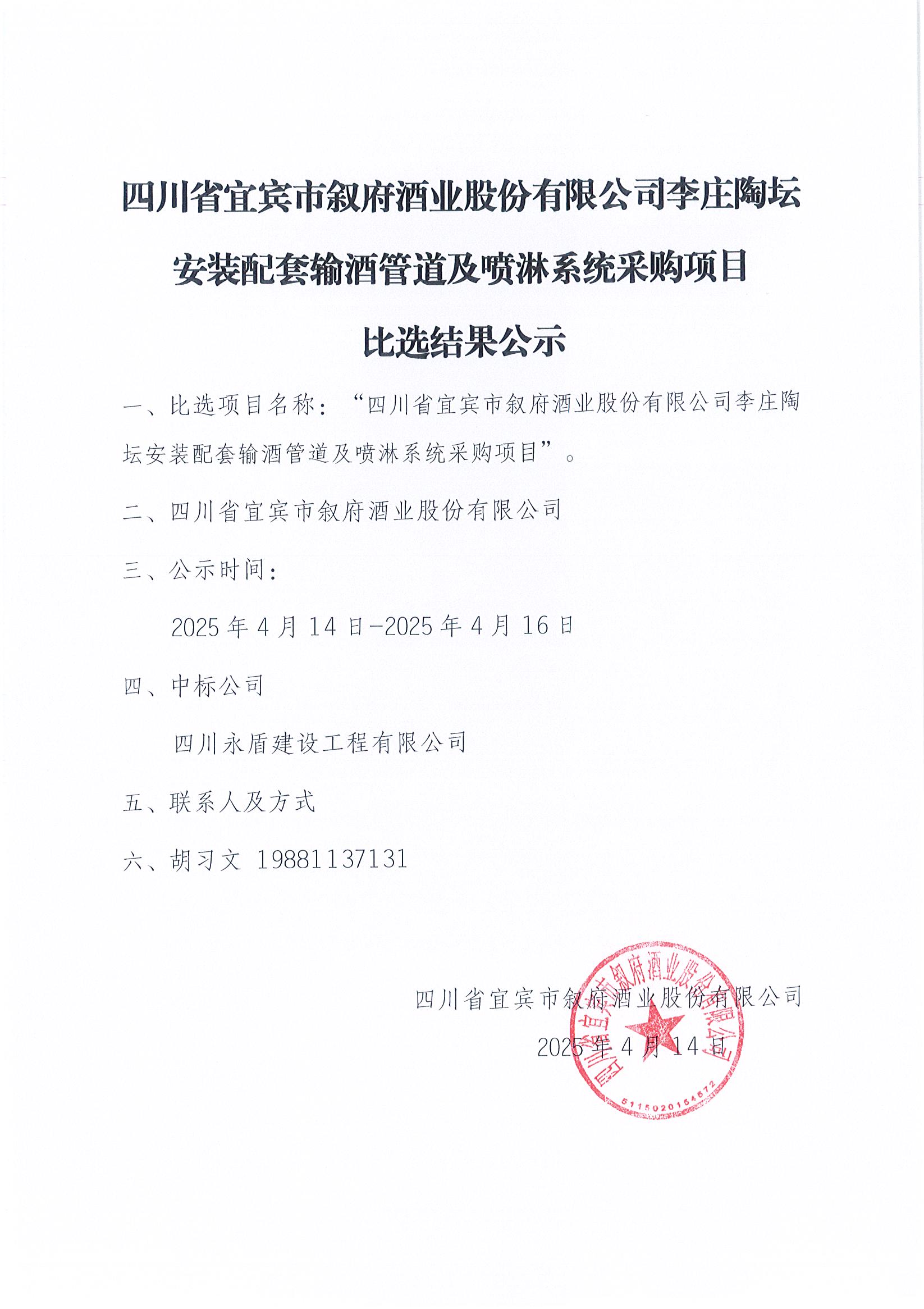 四川省宜賓市敘府酒業(yè)股份有限公司李莊陶壇安裝配套輸酒管道及噴淋系統(tǒng)采購(gòu)項(xiàng)目比選結(jié)果公告