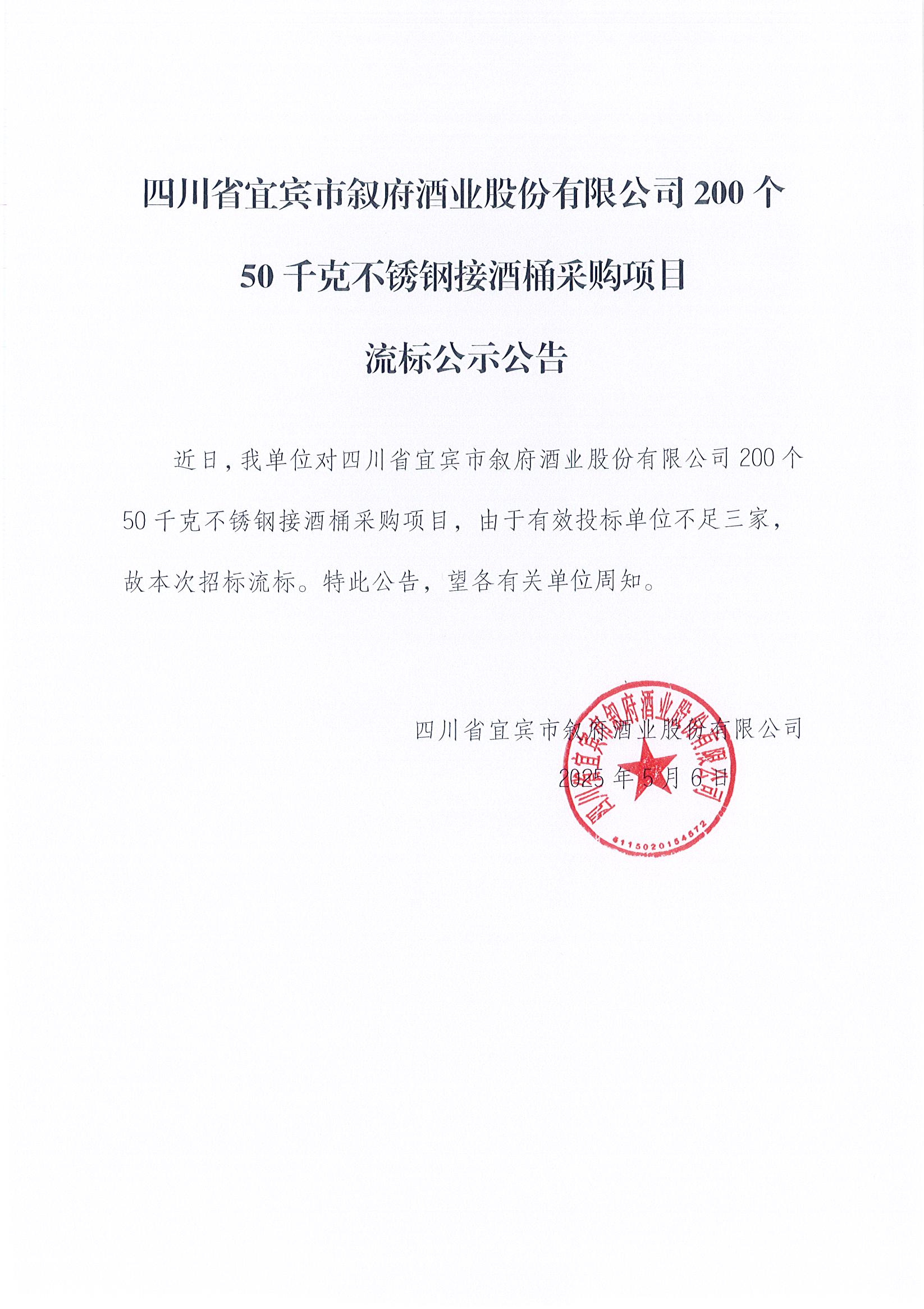 四川省宜賓市敘府酒業(yè)股份有限公司200個(gè)50千克不銹鋼接酒桶采購(gòu)項(xiàng)目流標(biāo)公示公告