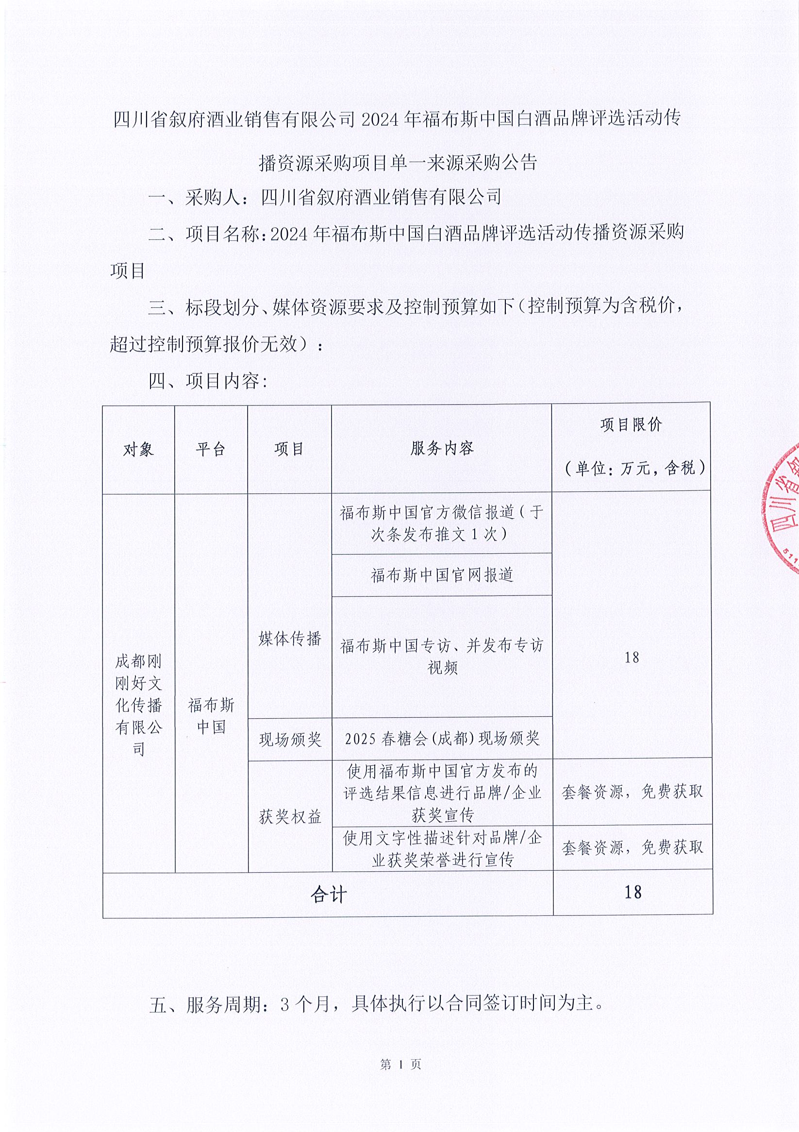 四川省敘府酒業(yè)銷售有限公司2024年福布斯中國白酒品牌評(píng)選活動(dòng)傳播資源采購項(xiàng)目單一來源采購公告