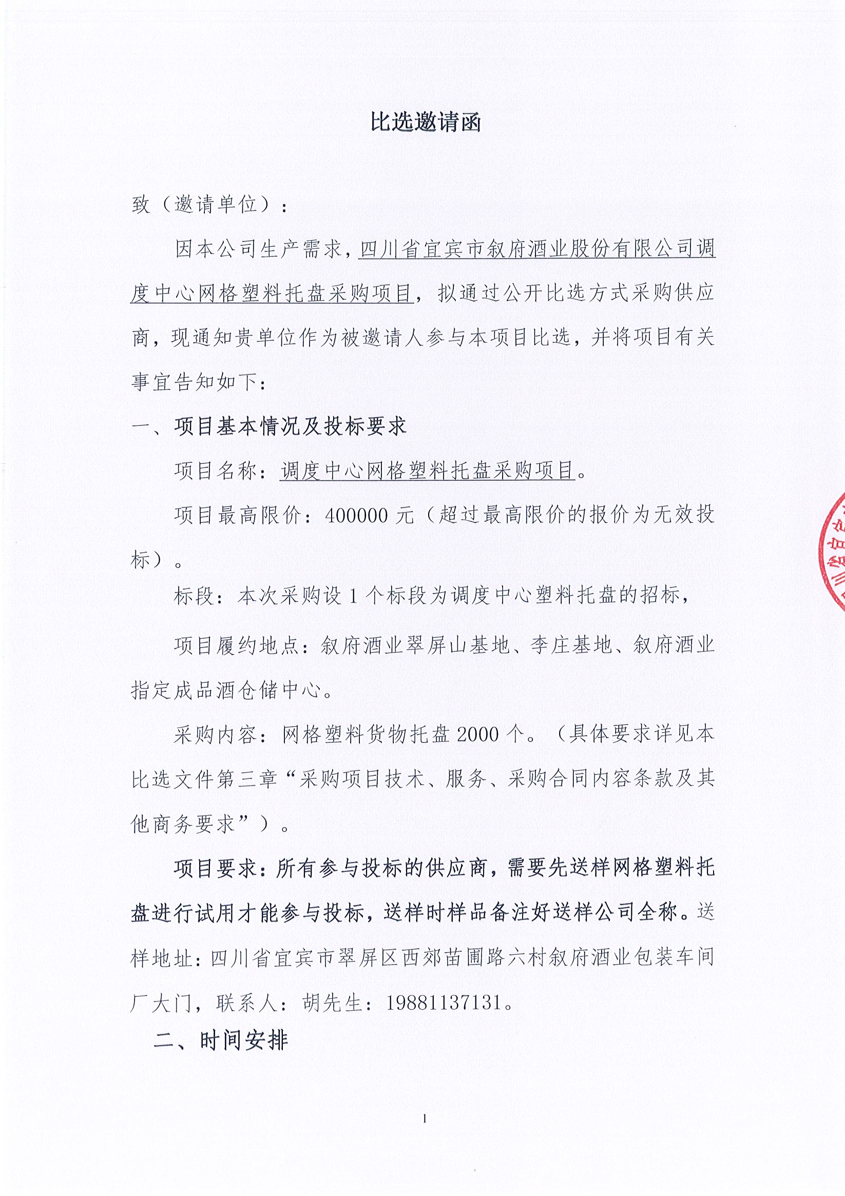 四川省宜賓市敘府酒業(yè)股份有限公司調(diào)度中心網(wǎng)格塑料托盤采購項(xiàng)目招標(biāo)公告