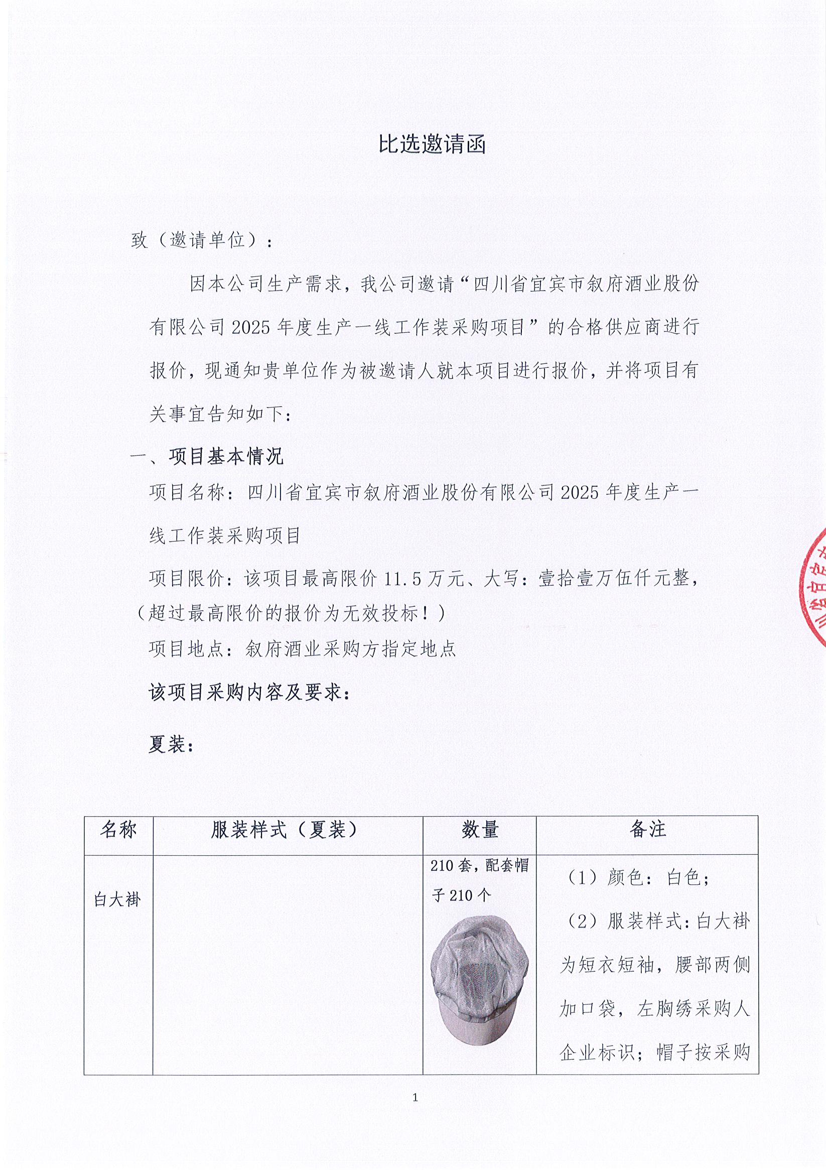 四川省宜賓市敘府酒業(yè)股份有限公司2025年度生產(chǎn)一線工作裝采購項(xiàng)目比選公告
