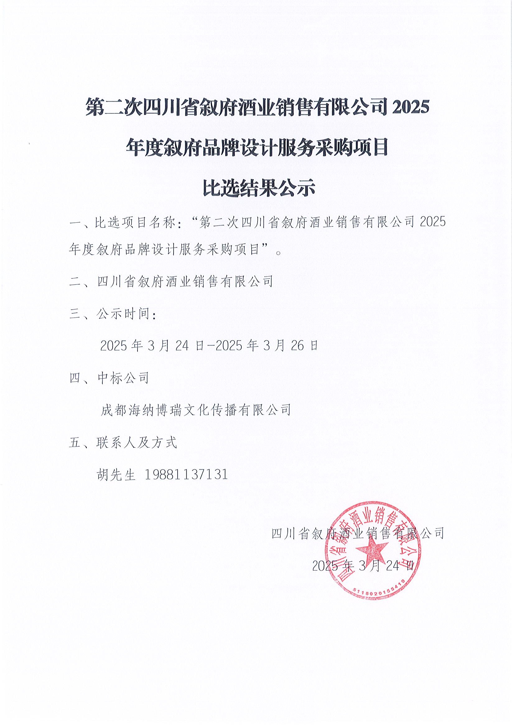 第二次四川省敘府酒業(yè)銷售有限公司2025年度敘府品牌設(shè)計(jì)服務(wù)采購項(xiàng)目比選結(jié)果公示