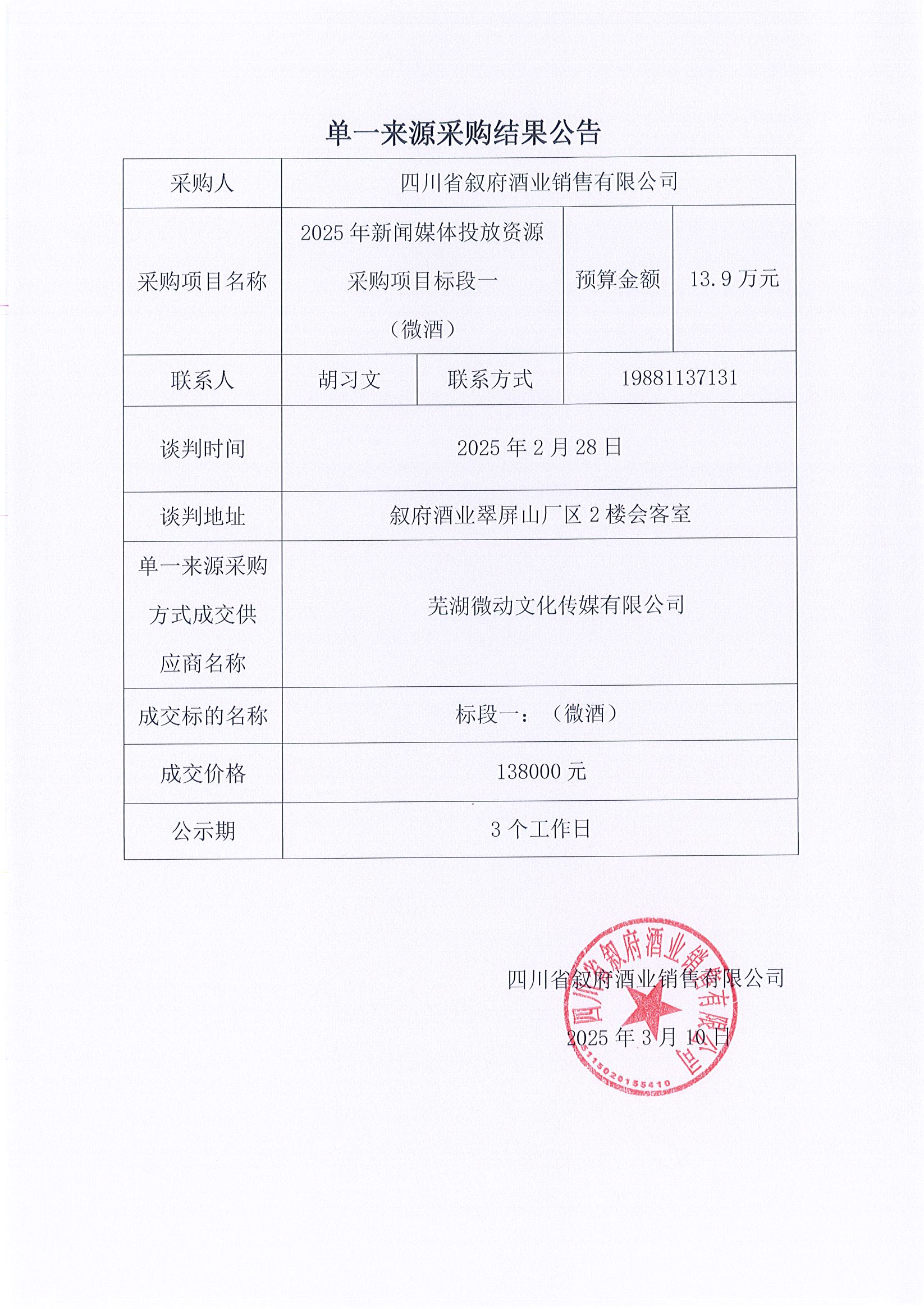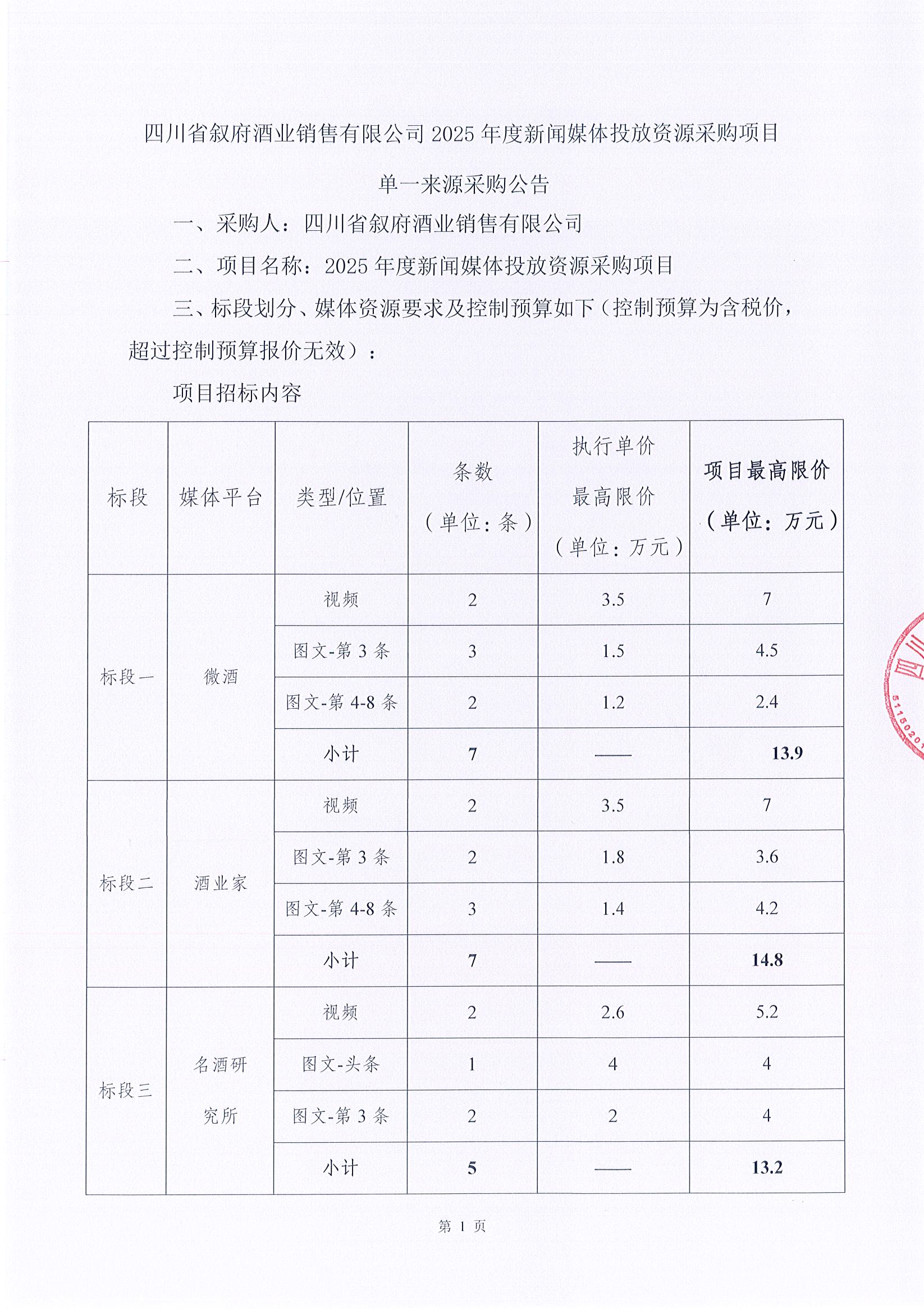 四川省敘府酒業(yè)銷售有限公司2025年度 新聞媒體投放資源采購項(xiàng)目單一來源各標(biāo)段中標(biāo)結(jié)果公示公告