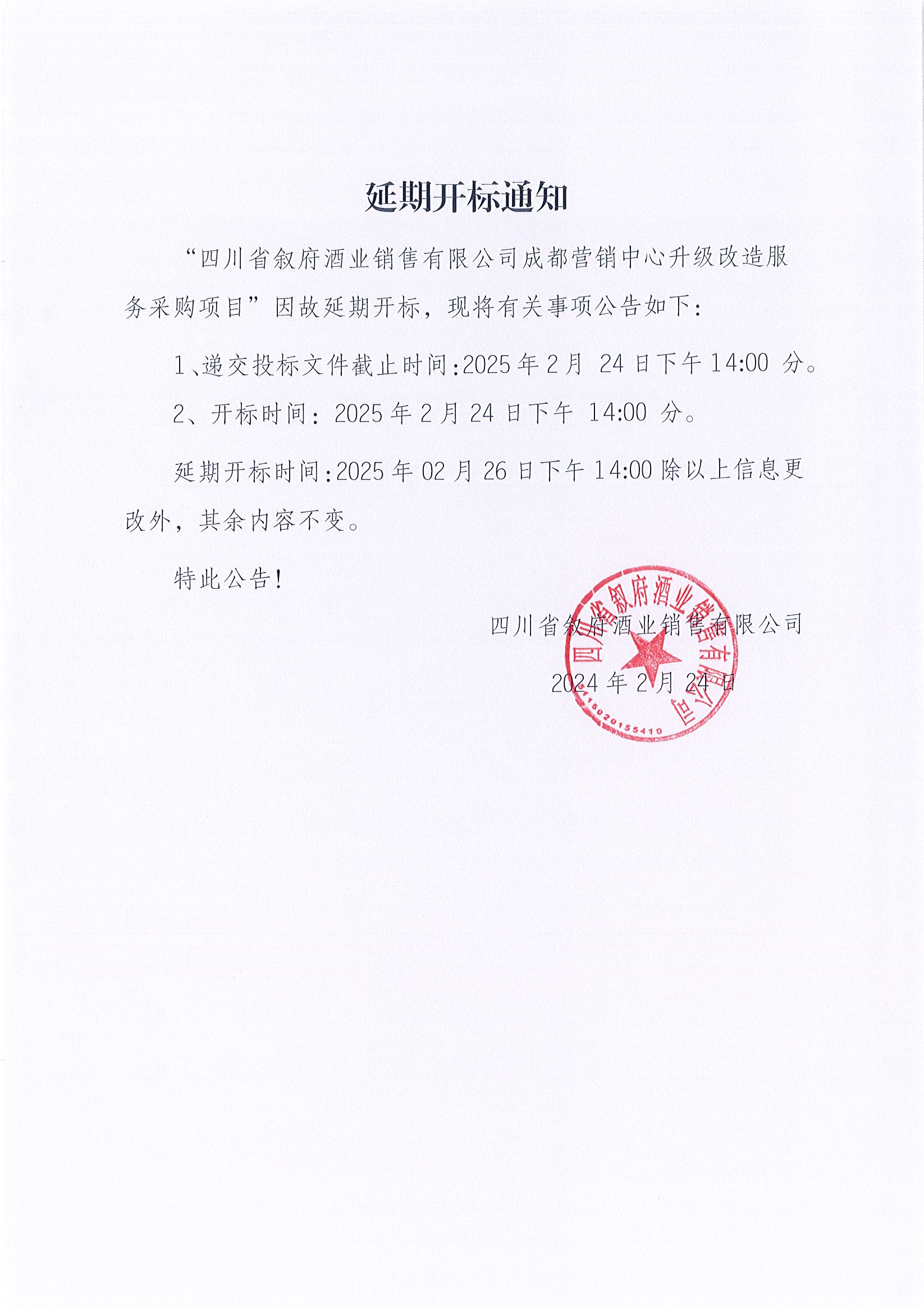 四川省敘府酒業(yè)銷售有限公司成都營銷中心升級(jí)改造服務(wù)采購項(xiàng)目延期開標(biāo)通知