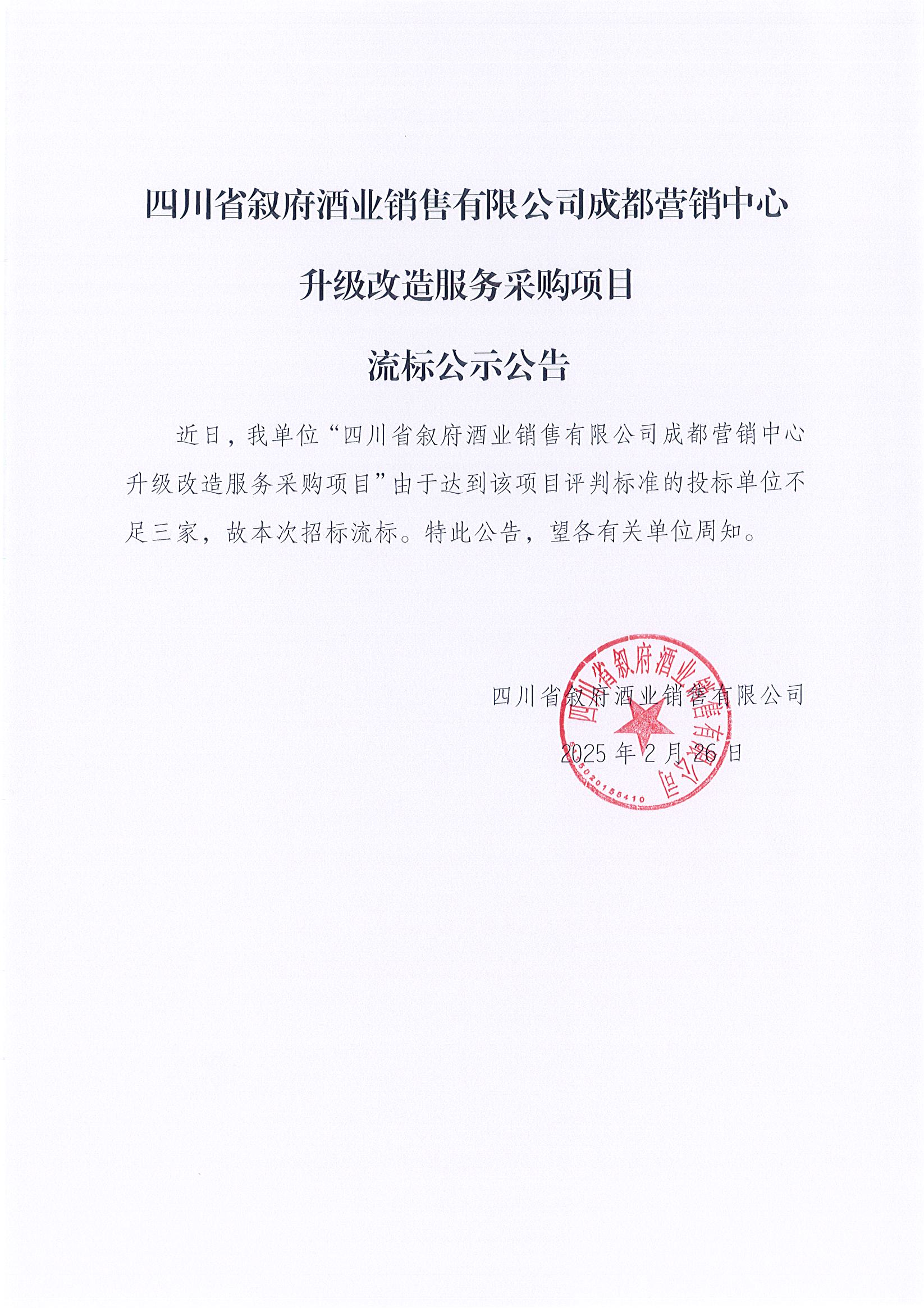 四川省敘府酒業(yè)銷售有限公司成都營銷中心升級(jí)改造服務(wù)采購項(xiàng)目流標(biāo)公示公告