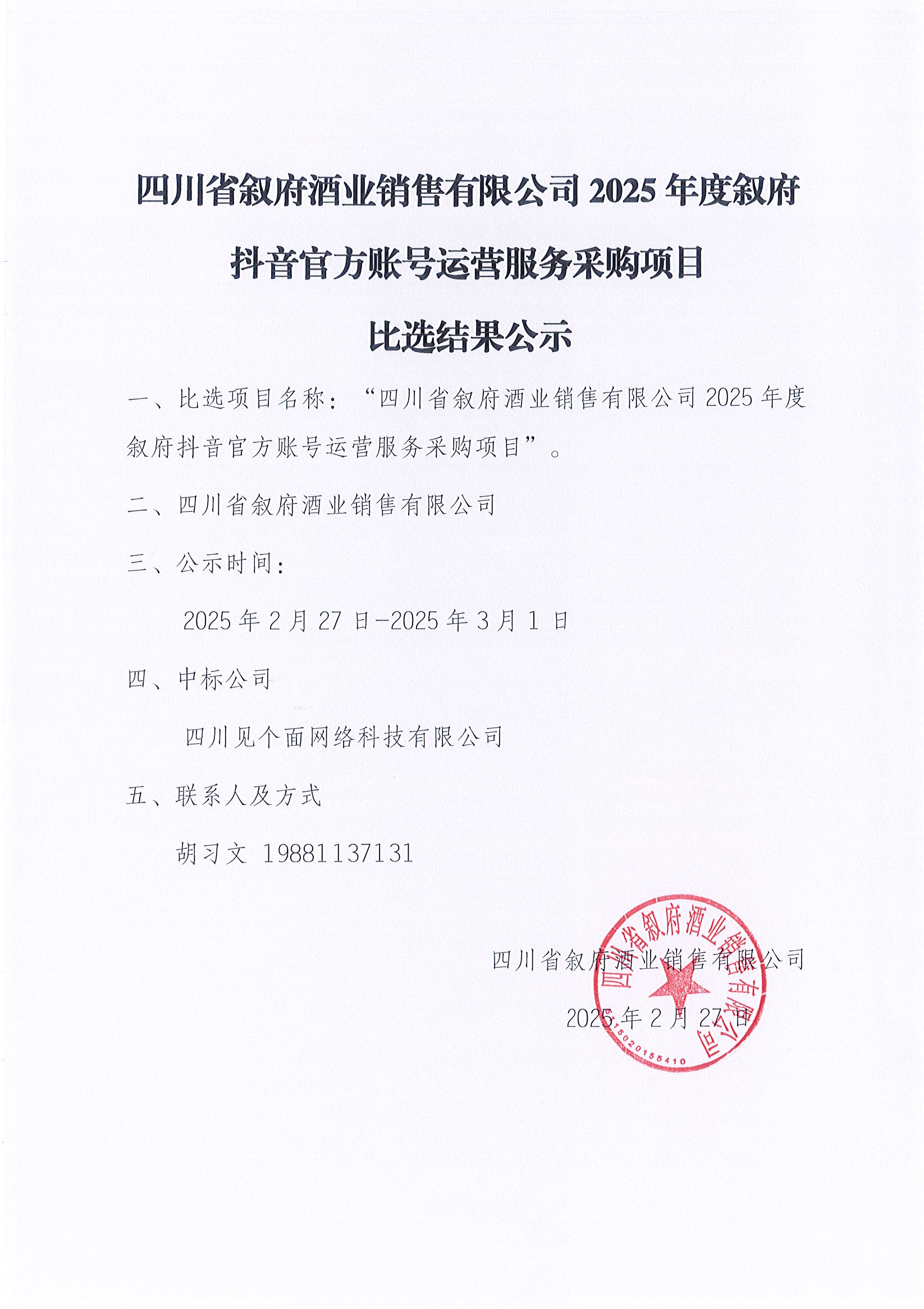 四川省敘府酒業(yè)銷售有限公司2025年度敘府抖音官方賬號(hào)運(yùn)營服務(wù)采購項(xiàng)目公開比選結(jié)果公示公告