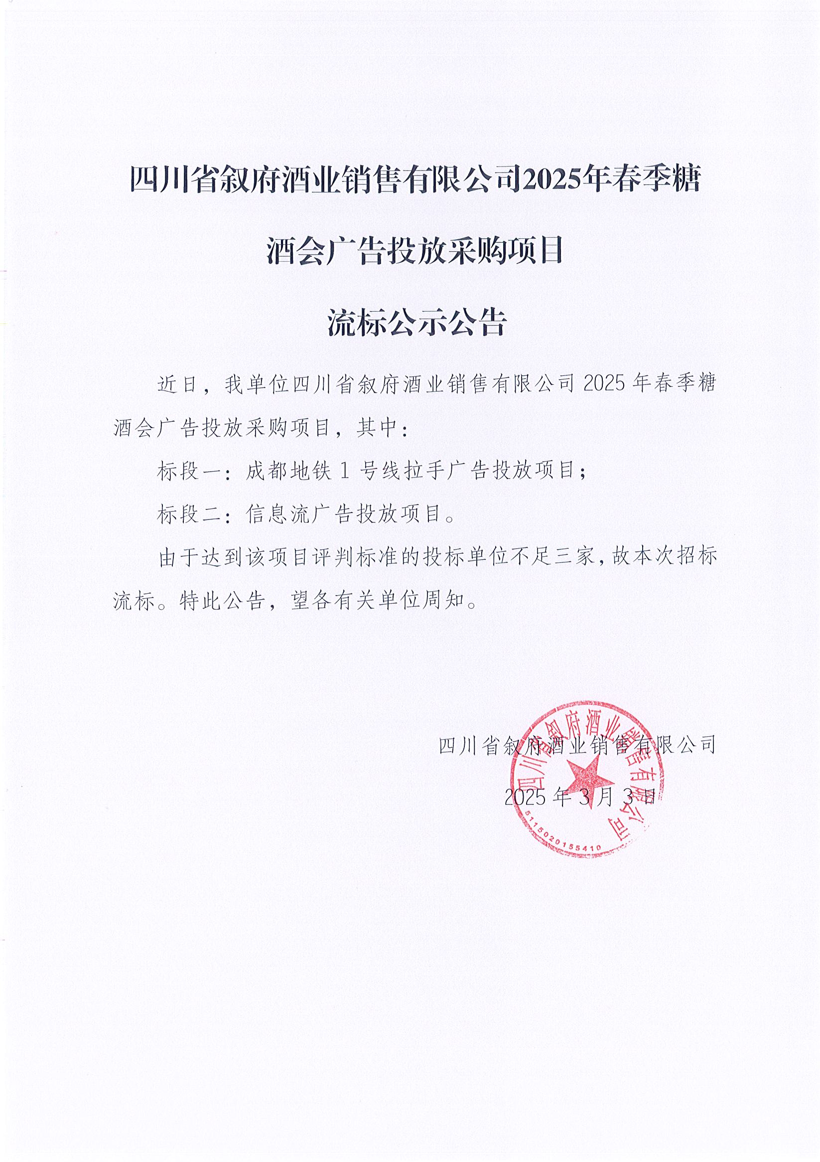 四川省敘府酒業(yè)銷售有限公司2025年春季糖酒會(huì)廣告投放采購項(xiàng)目流標(biāo)公示公告