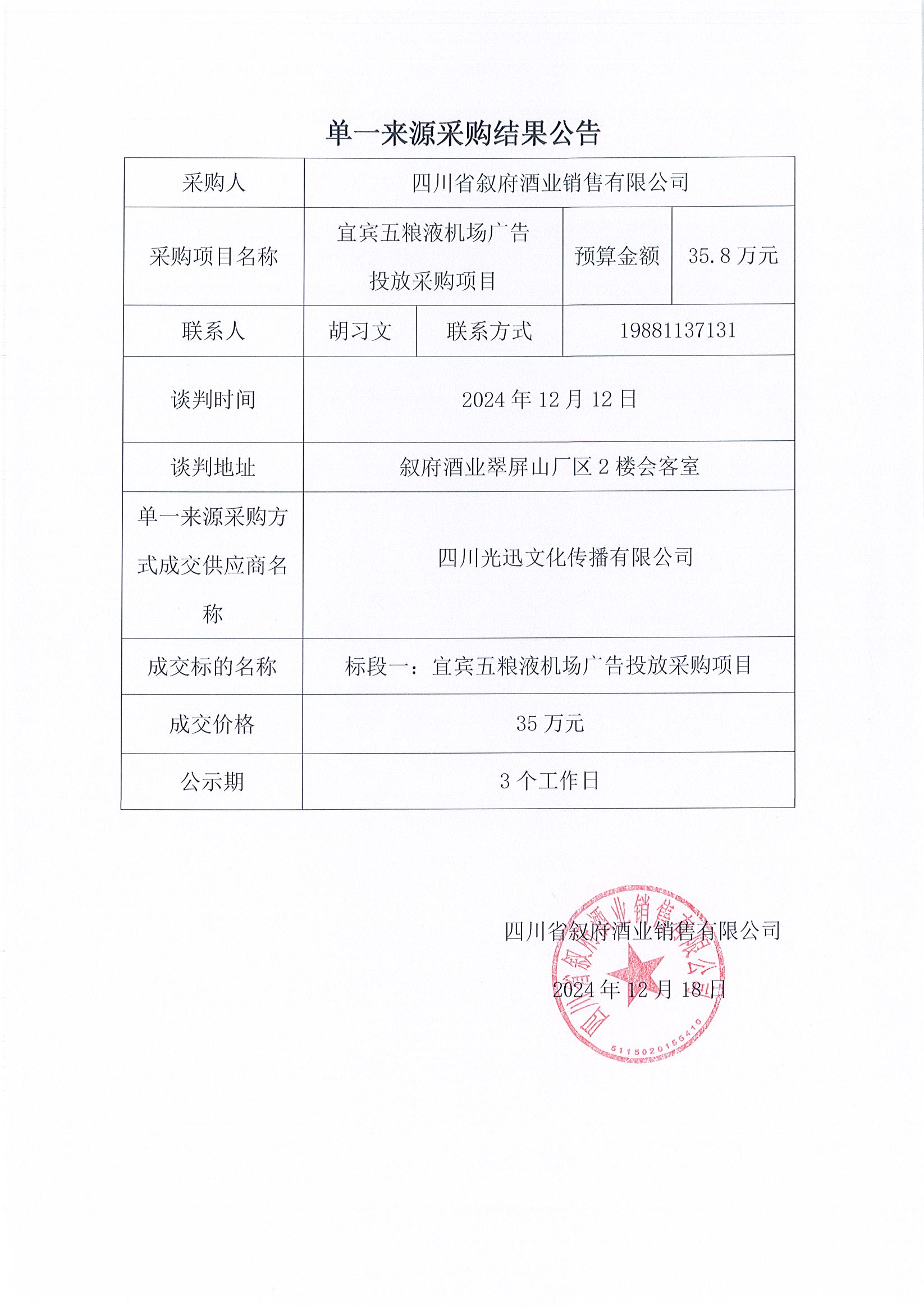 現(xiàn)公布2024年12月12日下午14:00召開的單一來源評標會無五個標段的采購結果 四川省敘府酒業(yè)銷售有限公司2024年第四季度敘府品牌廣告投放采購項目一標段至五標段的單一來源公...