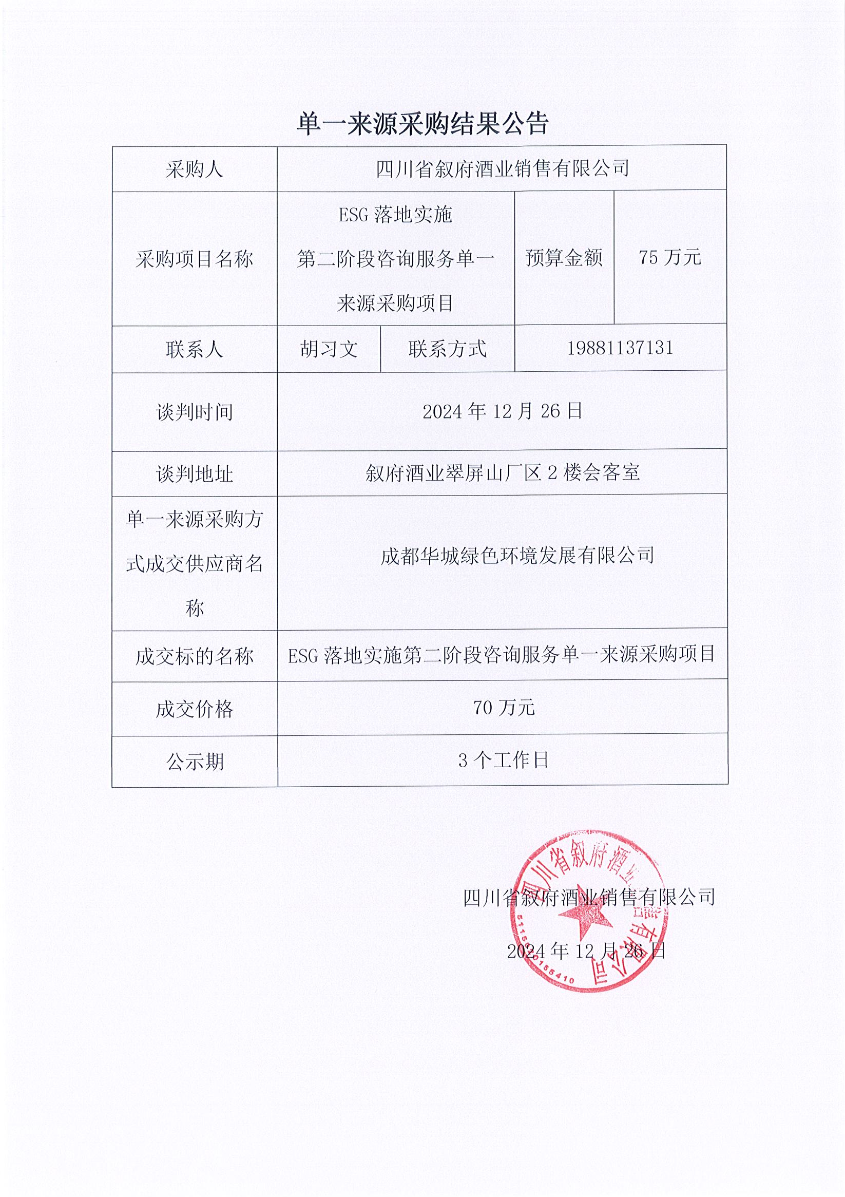 四川省敘府酒業(yè)銷售有限公司ESG落地實施 第二階段咨詢服務單一 來源采購項目結果公示公告