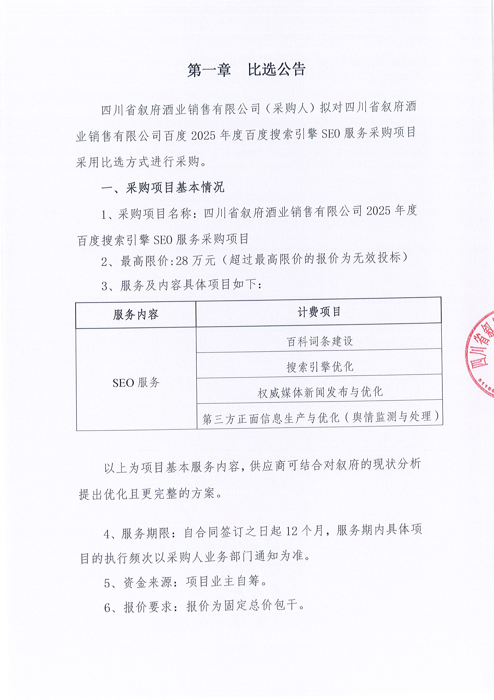 四川省敘府酒業(yè)銷售有限公司百度2025年度百度搜索引擎SEO服務采購項目比選公示公告