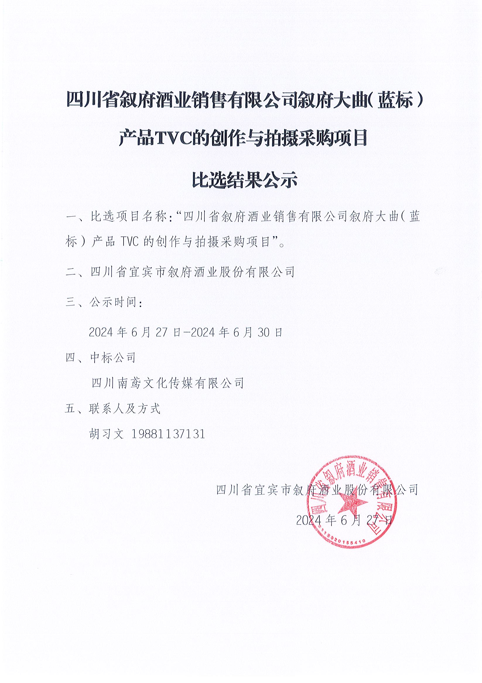 四川省敘府酒業(yè)銷售有限公司敘府大曲(藍(lán)標(biāo))產(chǎn)品TVC的創(chuàng)作與拍攝采購項目中標(biāo)結(jié)果公示公告