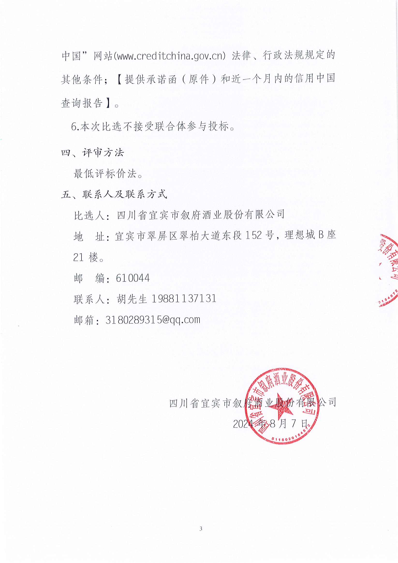 四川省宜賓市敘府酒業(yè)股份有限公司 翠屏山廠區(qū)2024-2025年丟糟出售項目競價邀請函公示公告