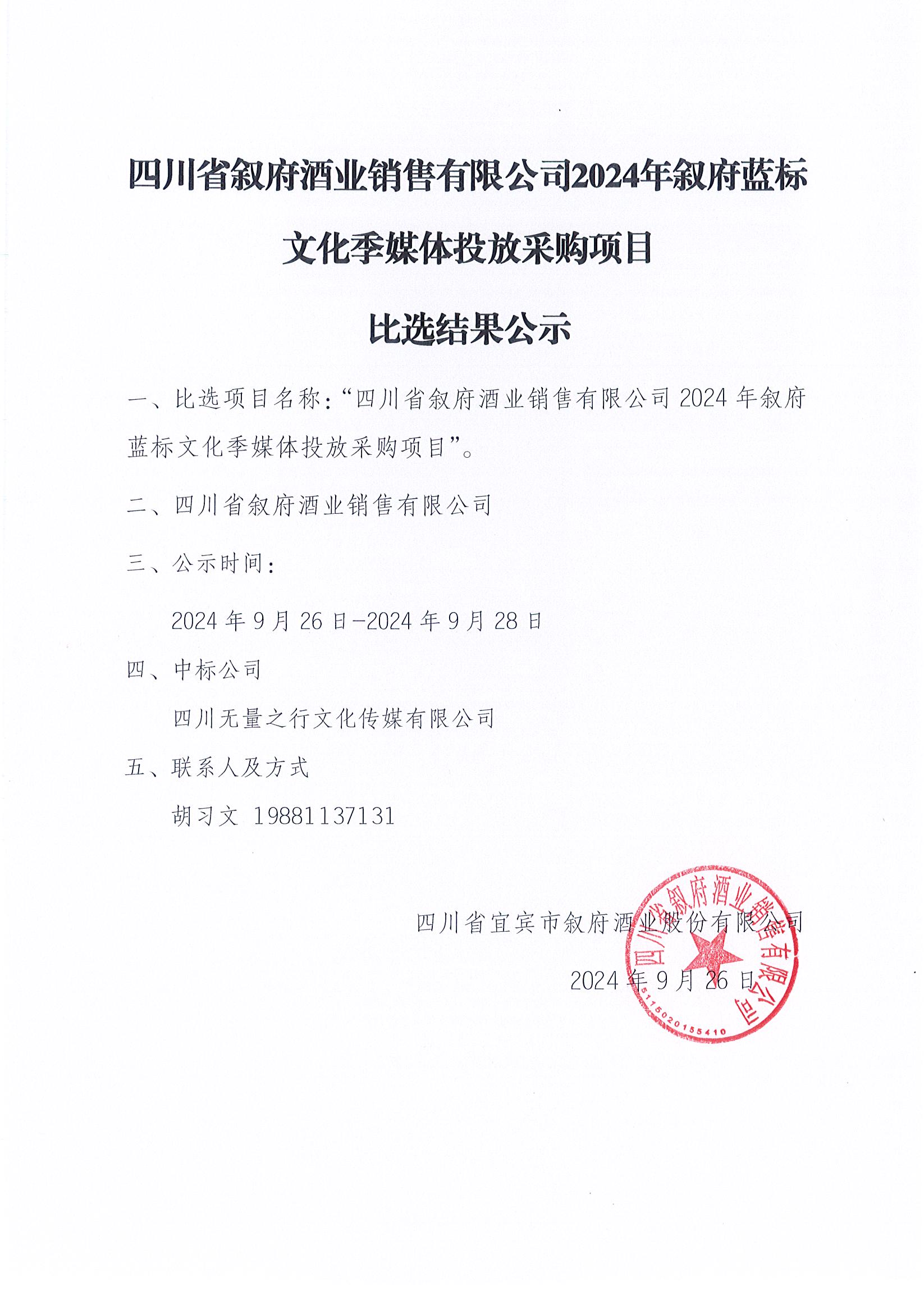 四川省敘府酒業(yè)銷售有限公司2024年敘府藍(lán)標(biāo)文化季媒體投放采購項(xiàng)目比選公示公告