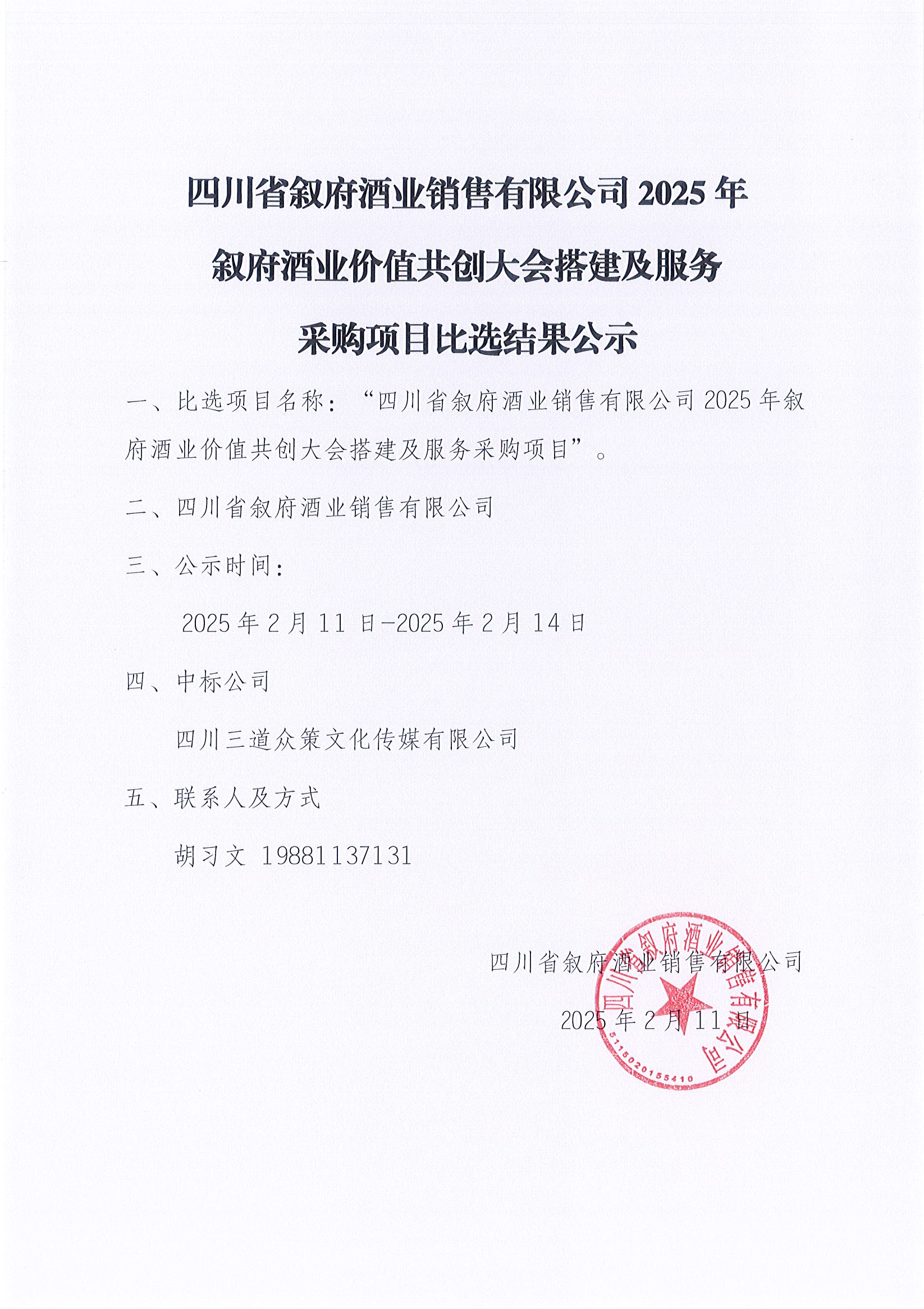 四川省敘府酒業(yè)銷售有限公司2025年度敘府抖音官方賬號(hào)運(yùn)營(yíng)服務(wù)采購(gòu)項(xiàng)目公開(kāi)比選招標(biāo)公示公告