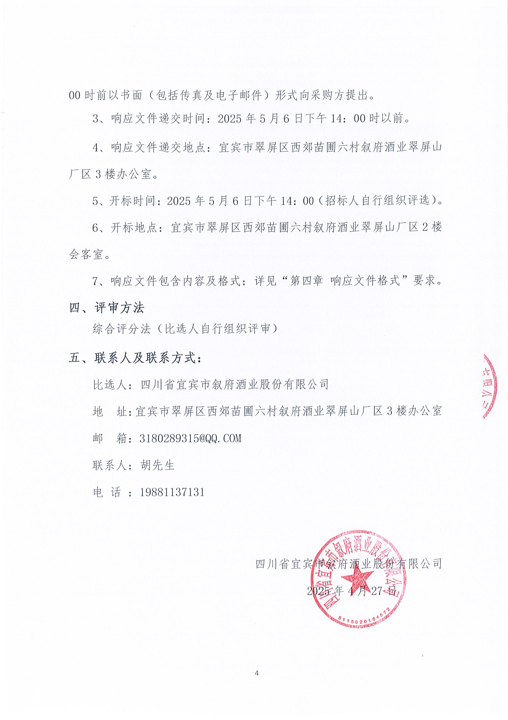 四川省宜賓市敘府酒業(yè)股份有限公司李莊陶壇安裝配套輸酒管道及噴淋系統(tǒng)采購項目比選結(jié)果公告