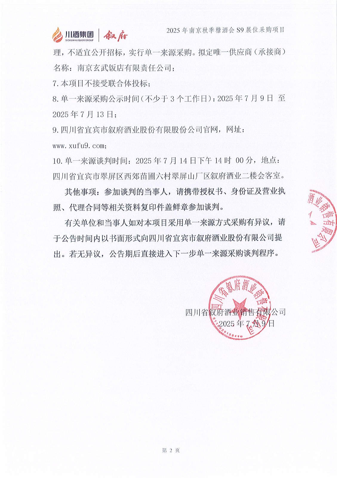四川省敘府酒業(yè)銷售有限公司 2025年南京秋季糖酒會S9展位采購公告單一來源采購公告