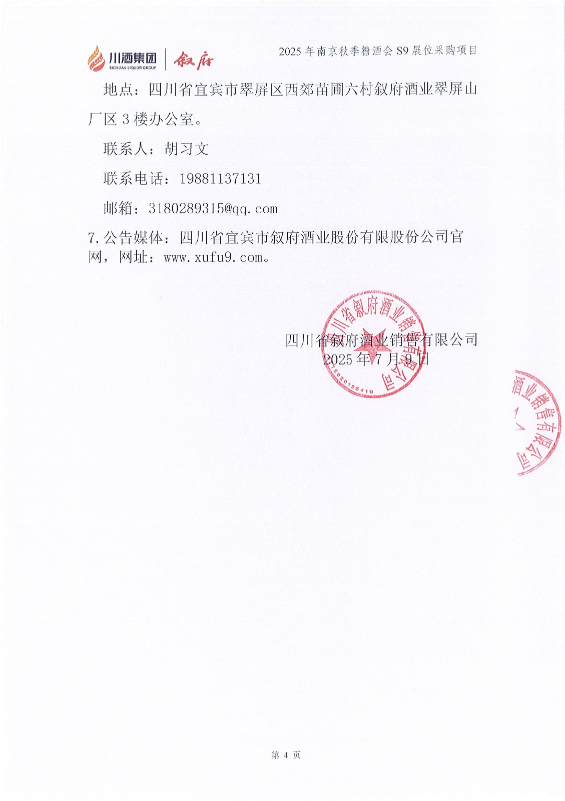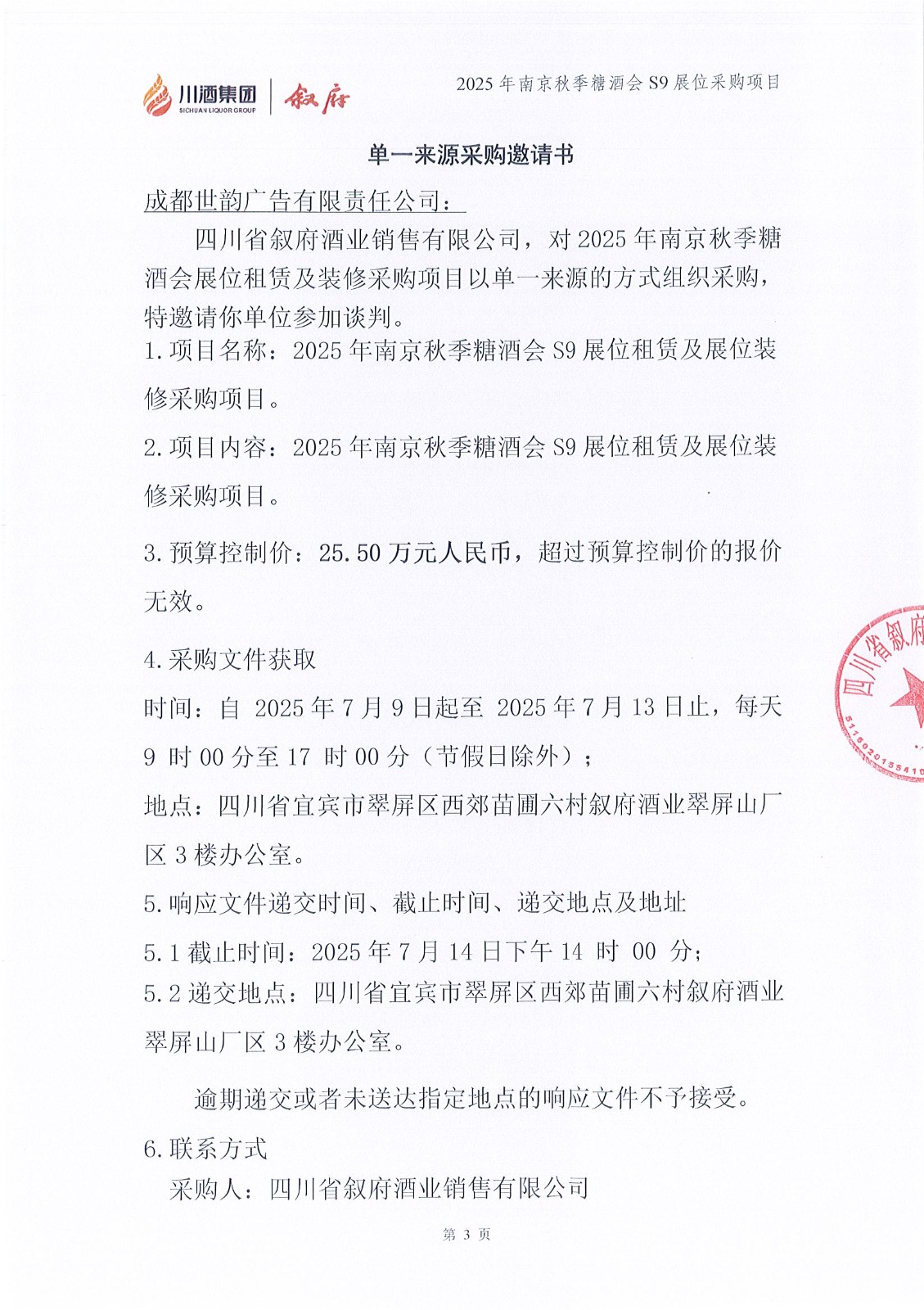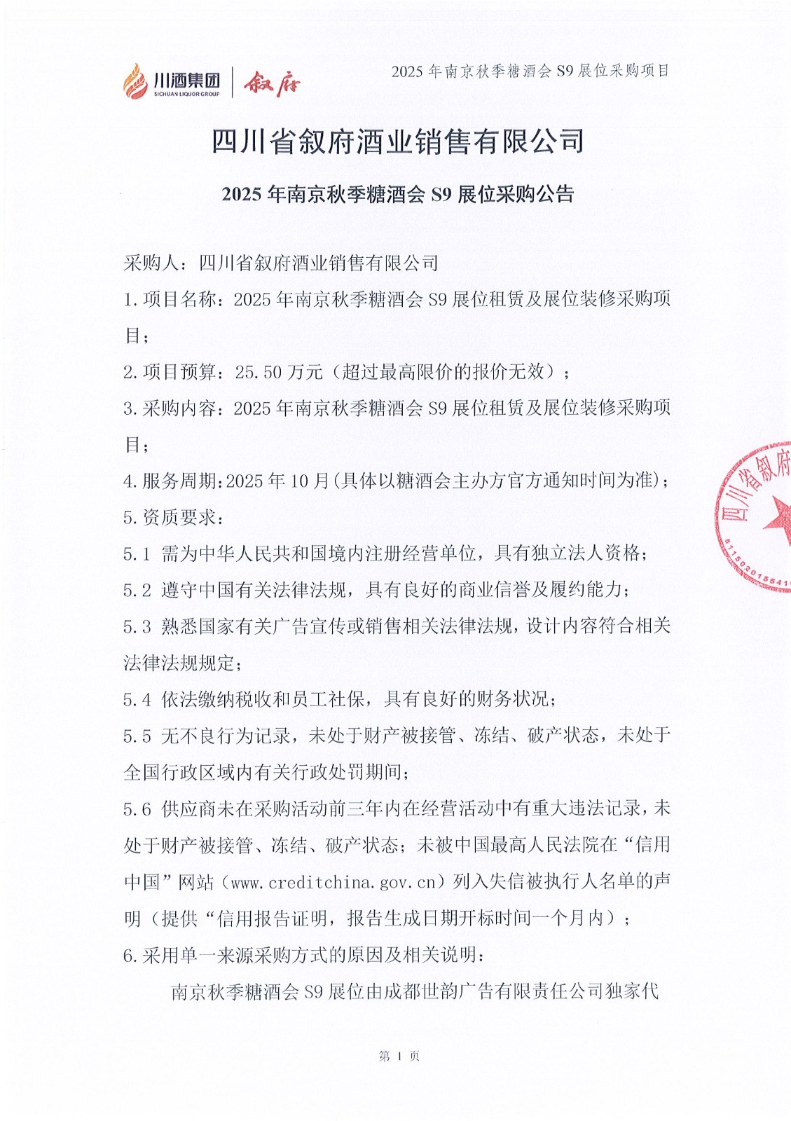 四川省敘府酒業(yè)銷售有限公司 2025年南京秋季糖酒會S9展位采購公告